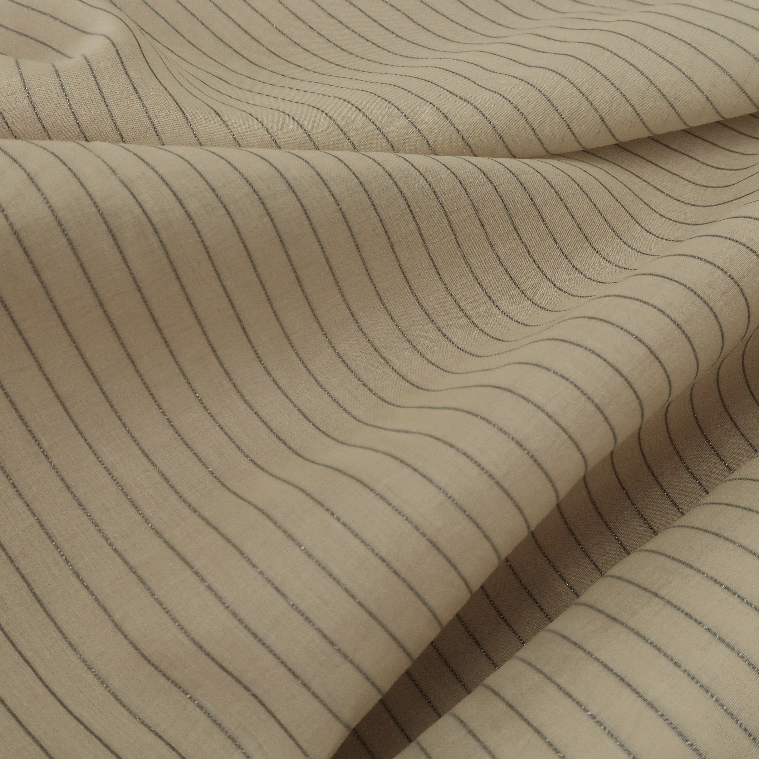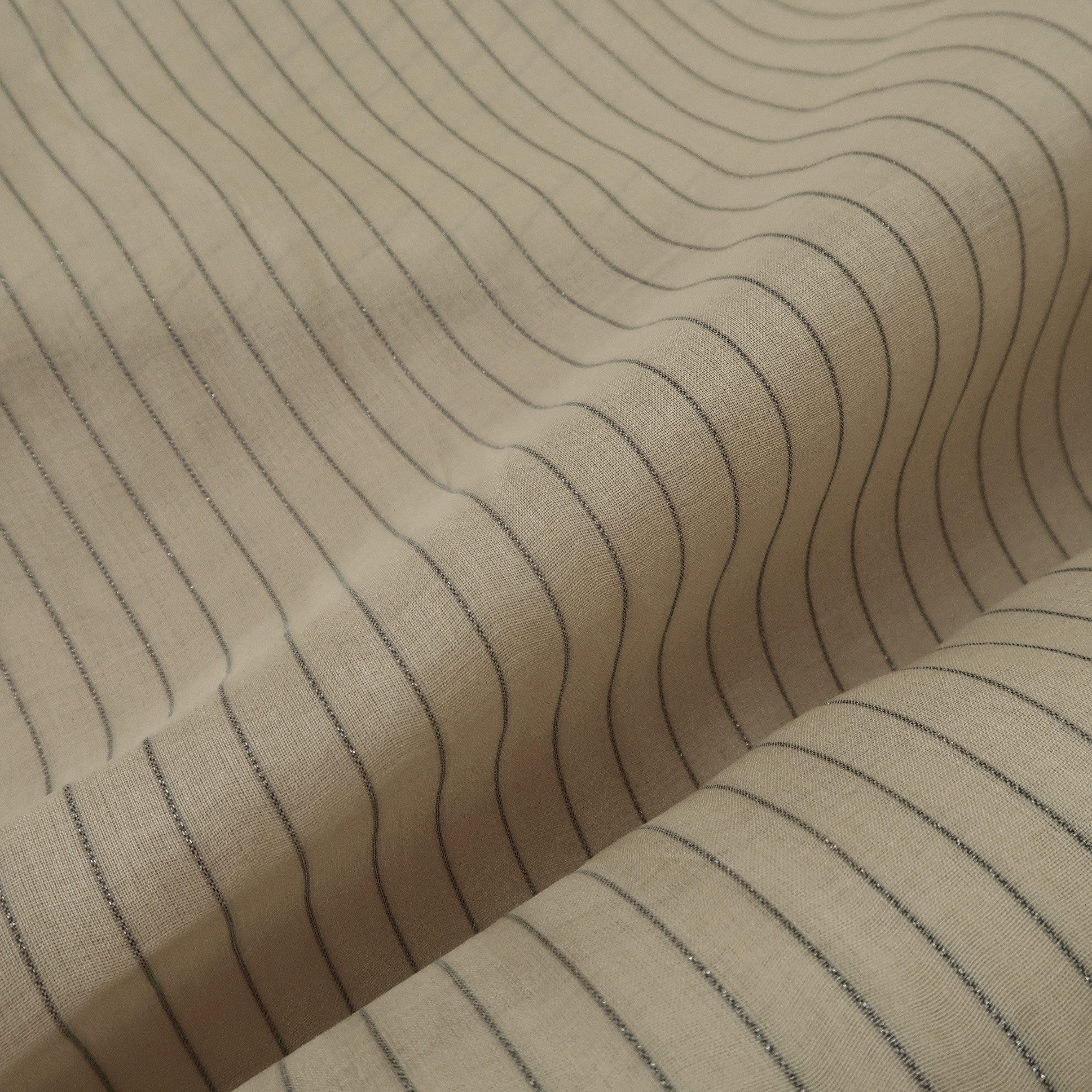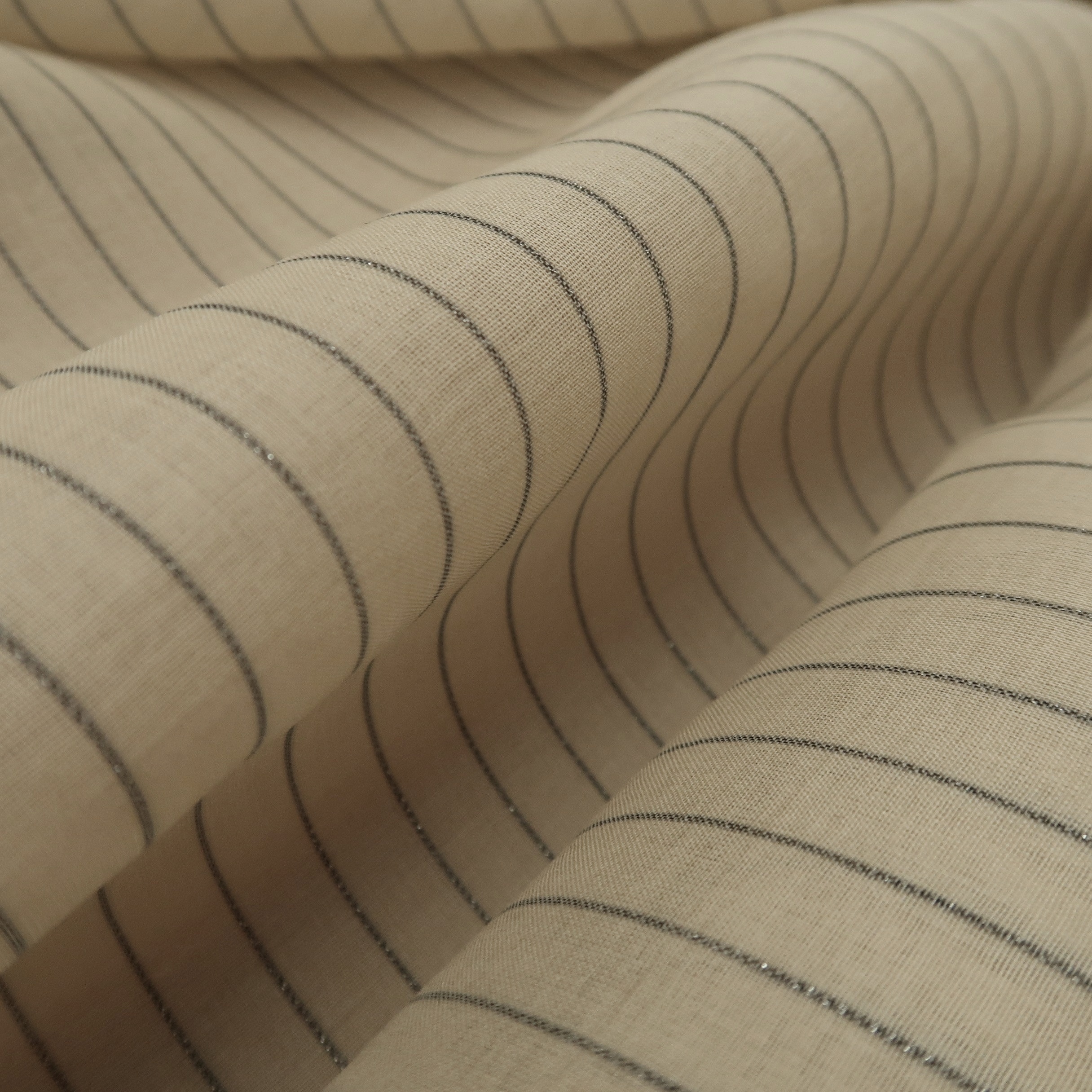Batist béžový s proužky lněný má charakter organtýnu. Je tuhší, po vyprání trochu změkne. Je nutné opět natužit nebo nechat méně tuhý. Gramáž je cca 60 g/m2.