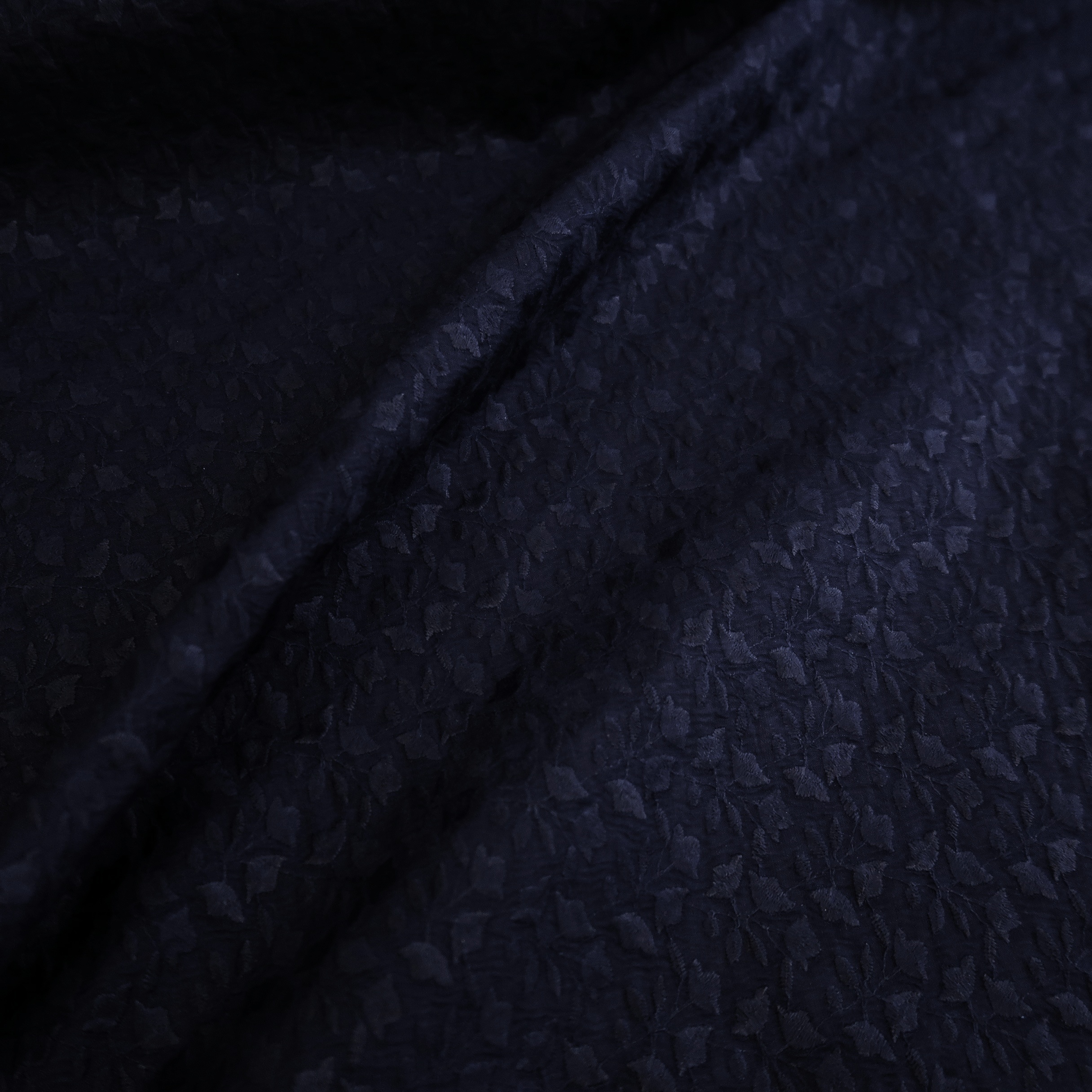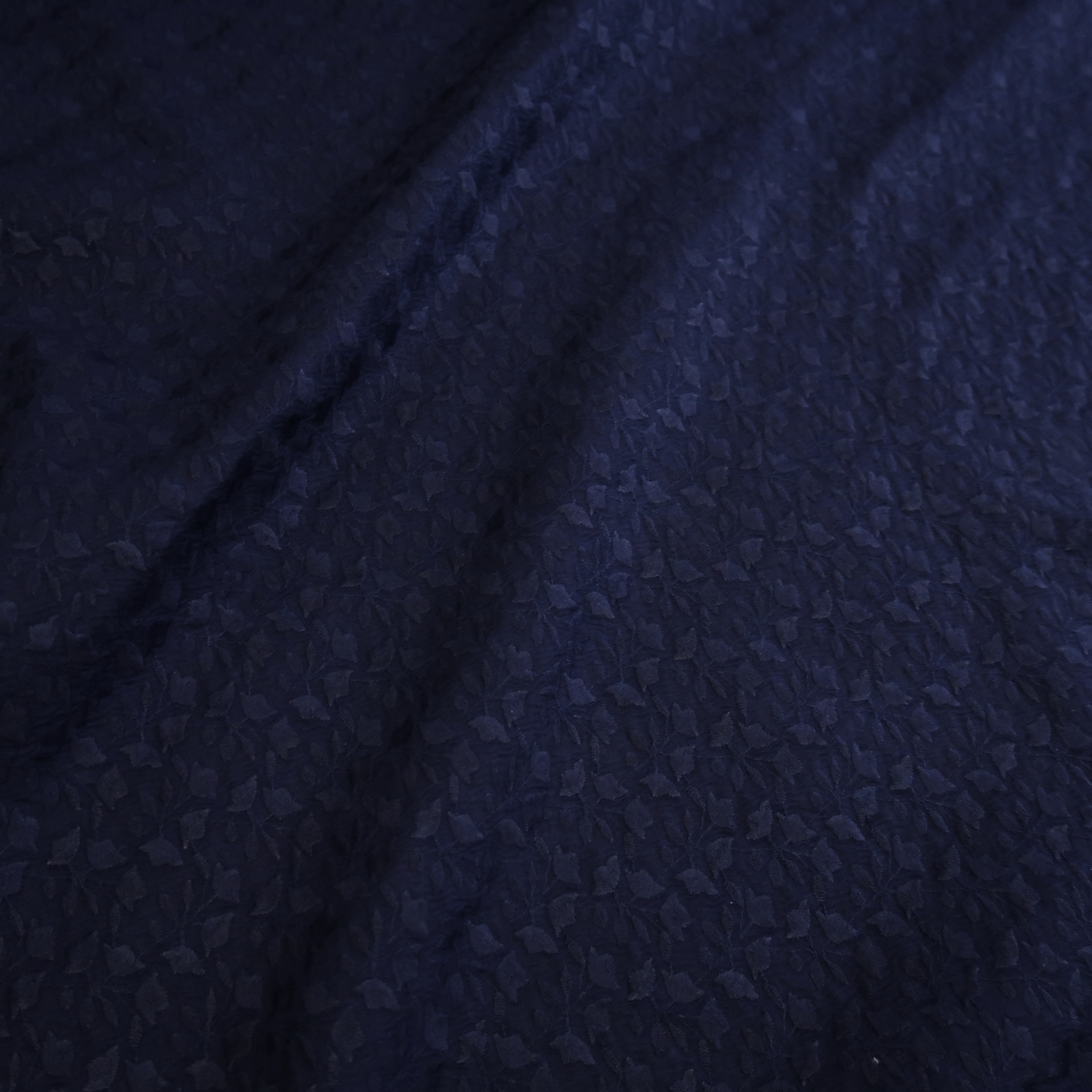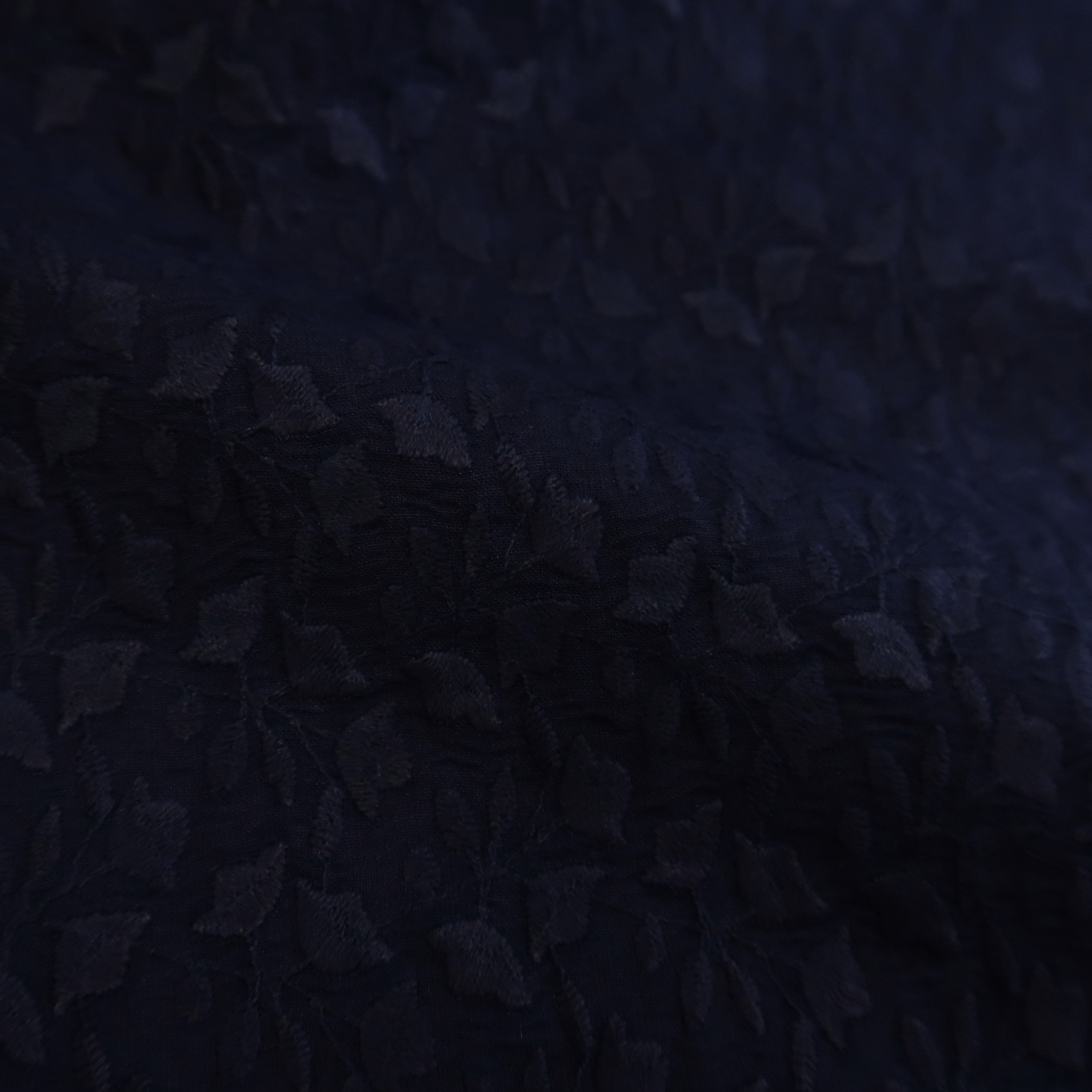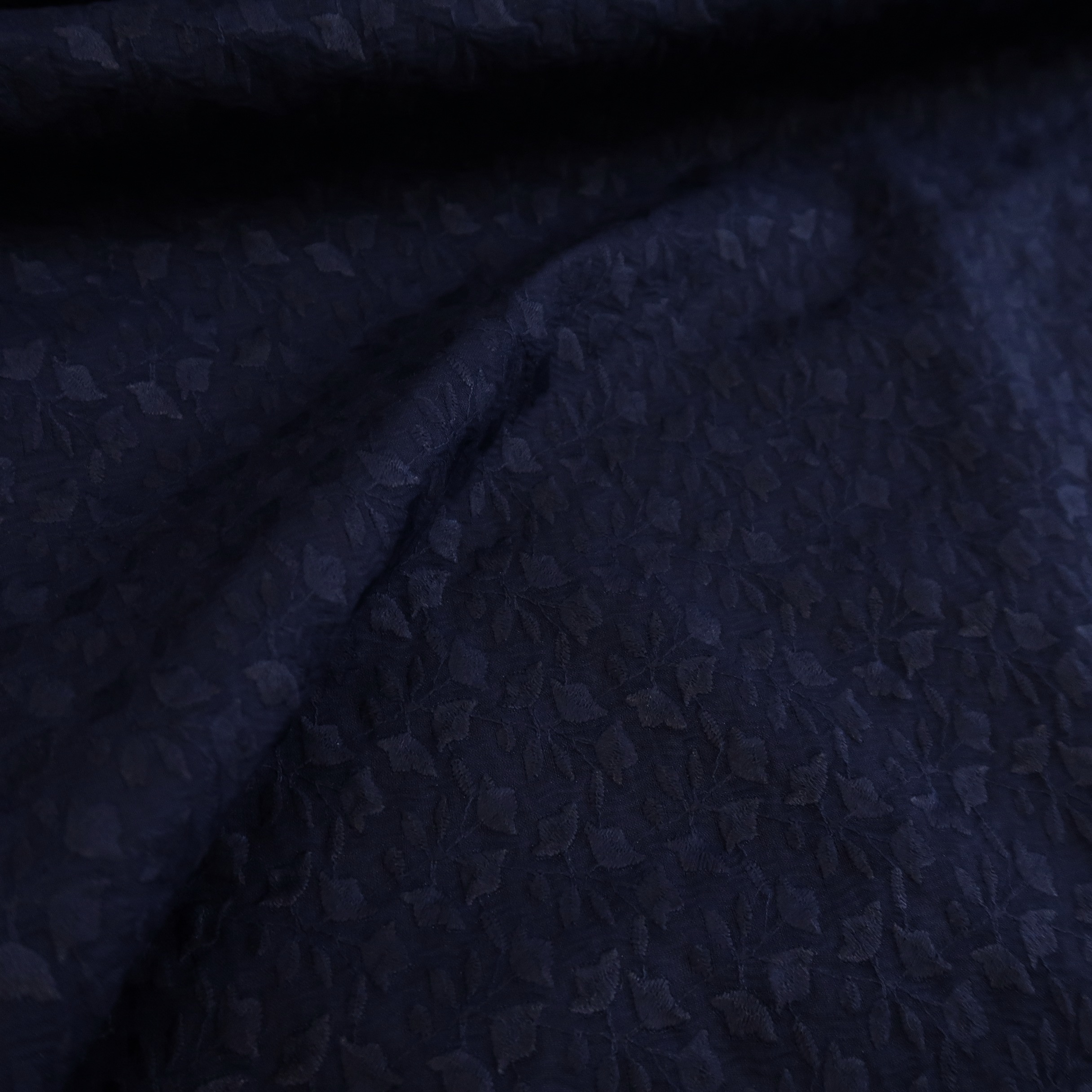 Batist modrý s hustou výšivkou je vlastně tenší látka, ale díky výšivce je zpevněná. Je barvená přírodním indigem, proto trochu barví a proto je třeba ji před šití ještě ustálit v octu.