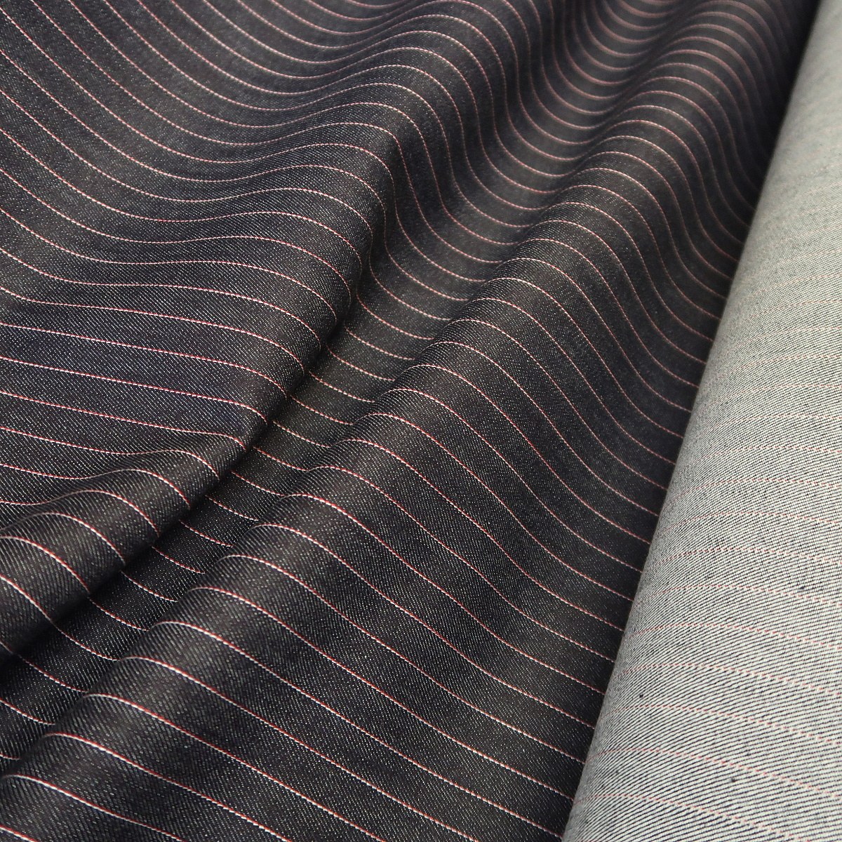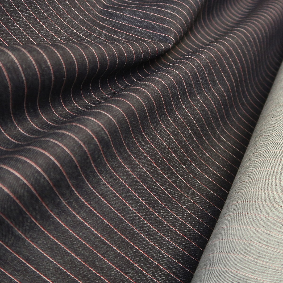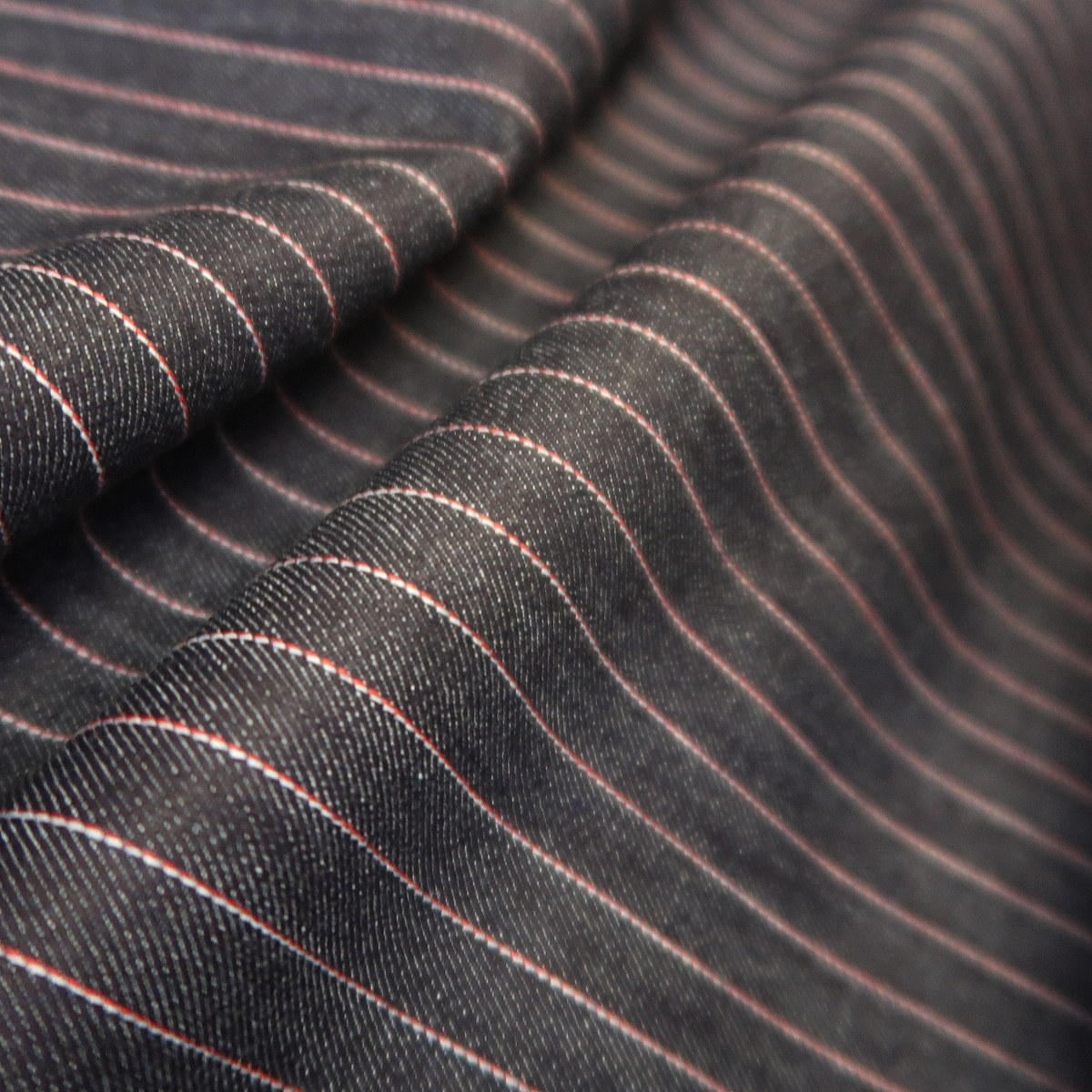 Denim modrý s bílo-červenými tenkými proužky je klasická jeansovina o gramáži cca 280 g/m2.