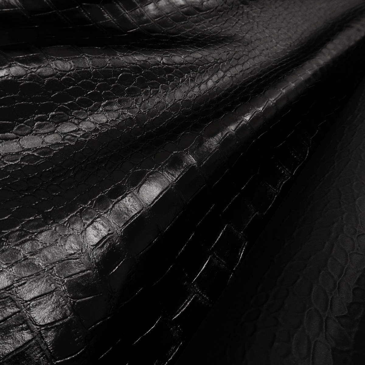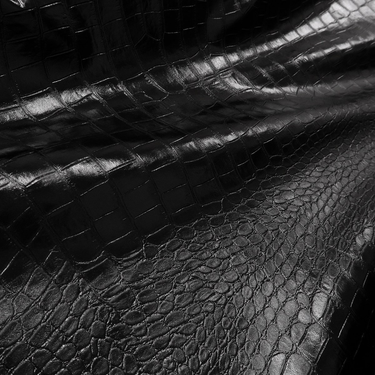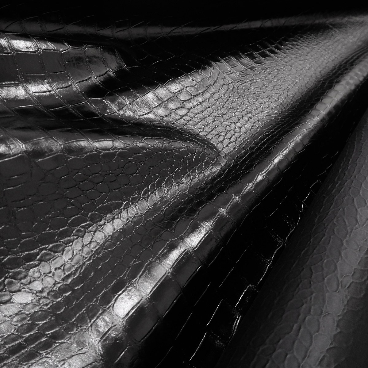 Imitace kůže černá á la krokodýl je látka s lesklým povrchem , je tuhší, spíše na bundy nebo kabát a gramáž je cca 360 g/m2.