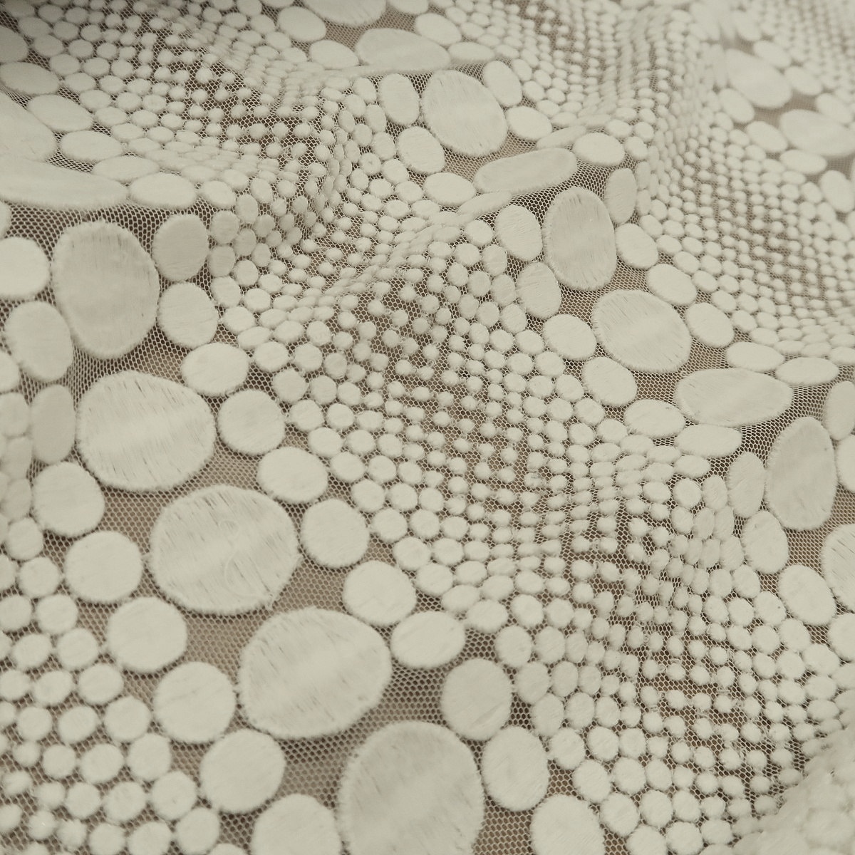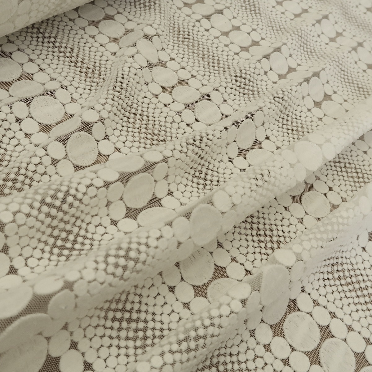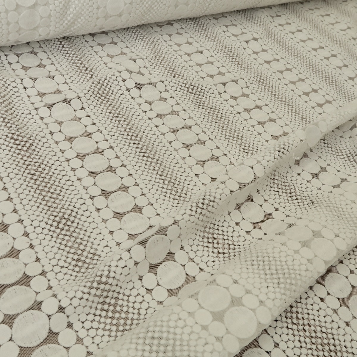 Krajka bílá s vyšívanými puntíky má tylový základ a puntíky v různých velikostech jsou na tyl vyšity v pruzích. Gramáž je cca 300 g/m2.