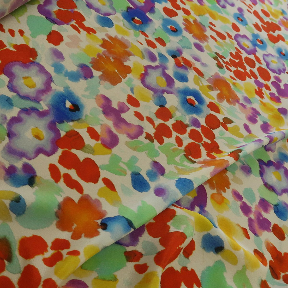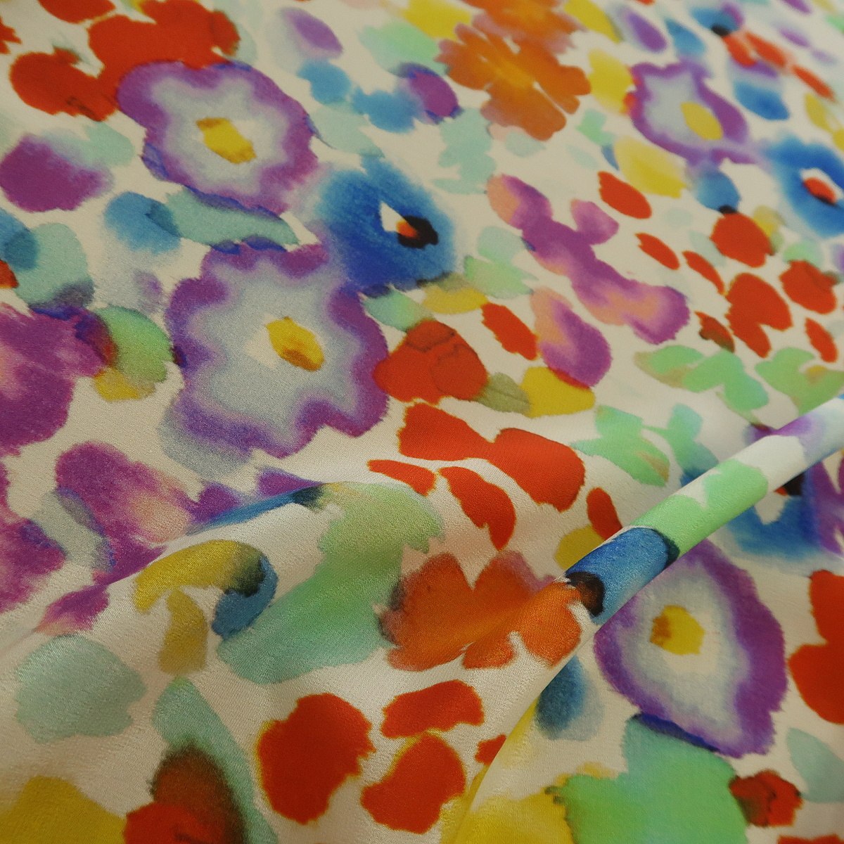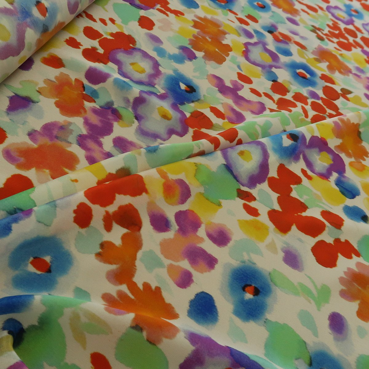 Krepdešín bílý s barevnými skvrnami je nádherná splývavá látka o gramáži cca 55 g/m2. Tato látka je poloprůsvitná, lehoučká.