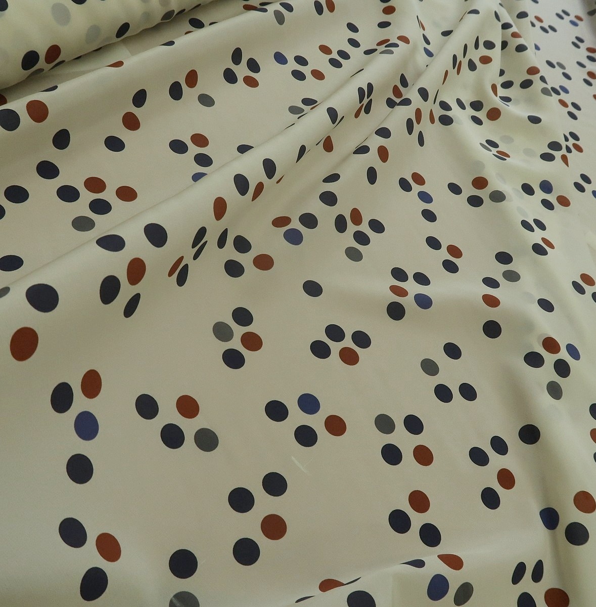 Krepdešín smetanový s puntíky je nádherná splývavá látka o gramáži cca 75 g/m2. Velikost puntíků je asi 1,4 cm.