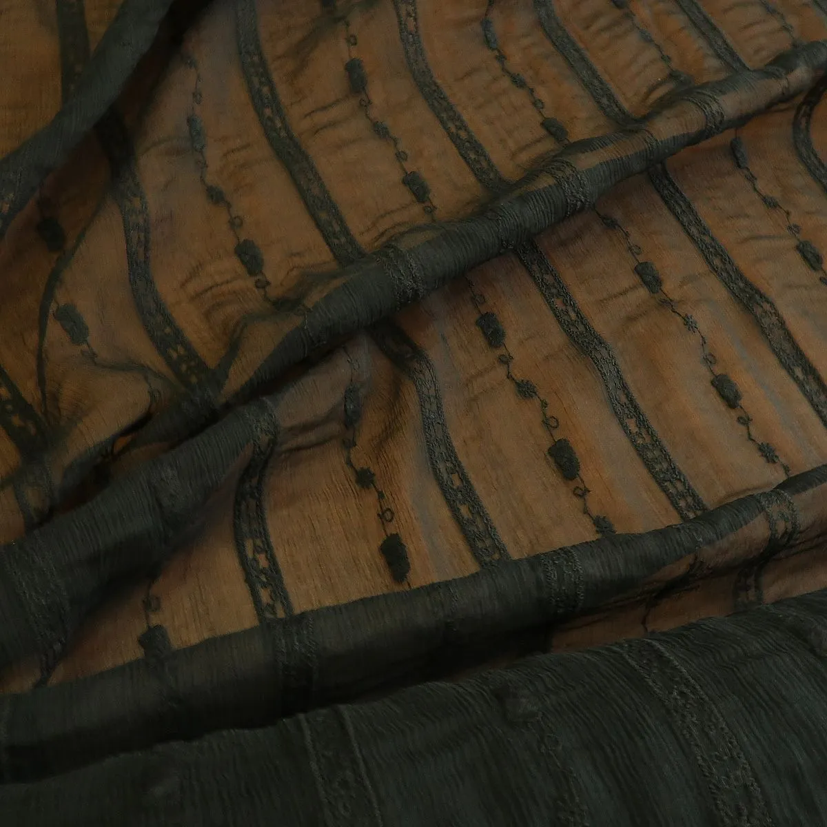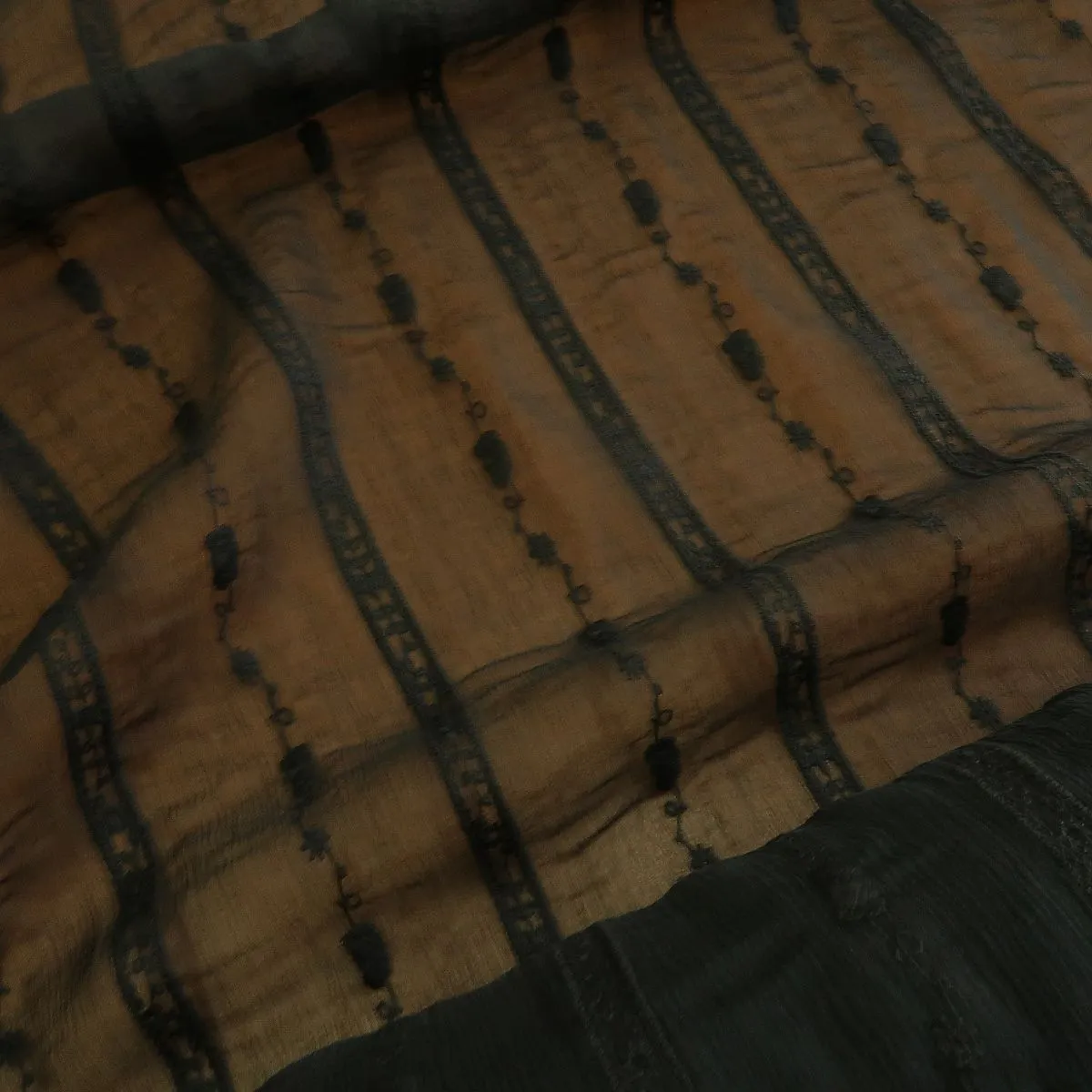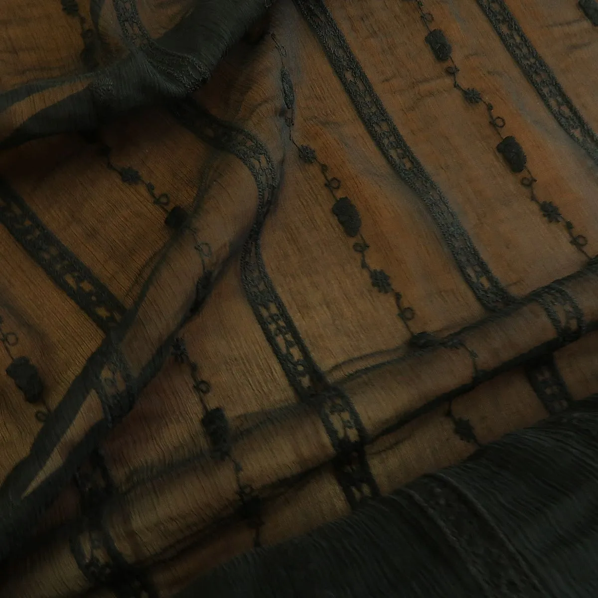 Mušelín černý vyšívaný je lehoučká, průhledná látka o gramáži cca 40 g/m2. Je vhodná na volnější modely.