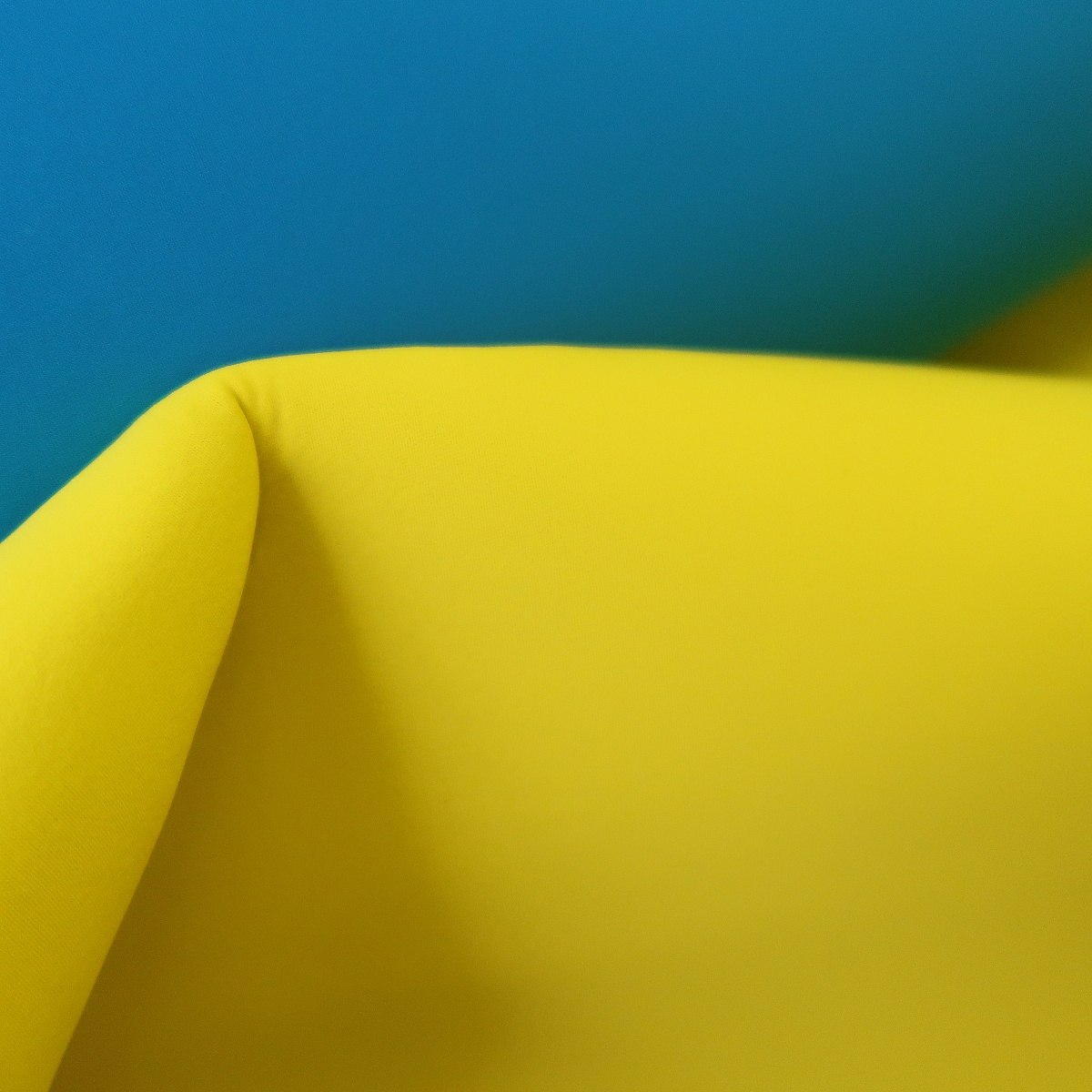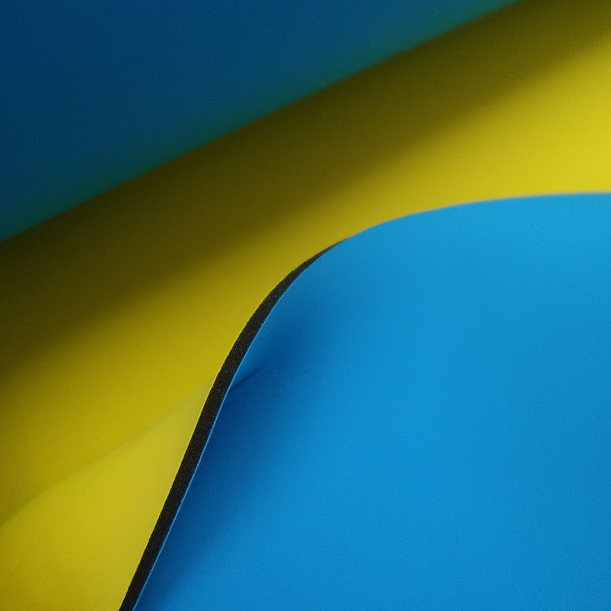 Neopren žlutý a modrý double je 0,5 cm široký, poddajný nepren. Z jedné strany je žlutý, z druhé strany je světle modrý. Vnitřek je vyplněn molitanem. Gramáž je cca 270 g/m2.