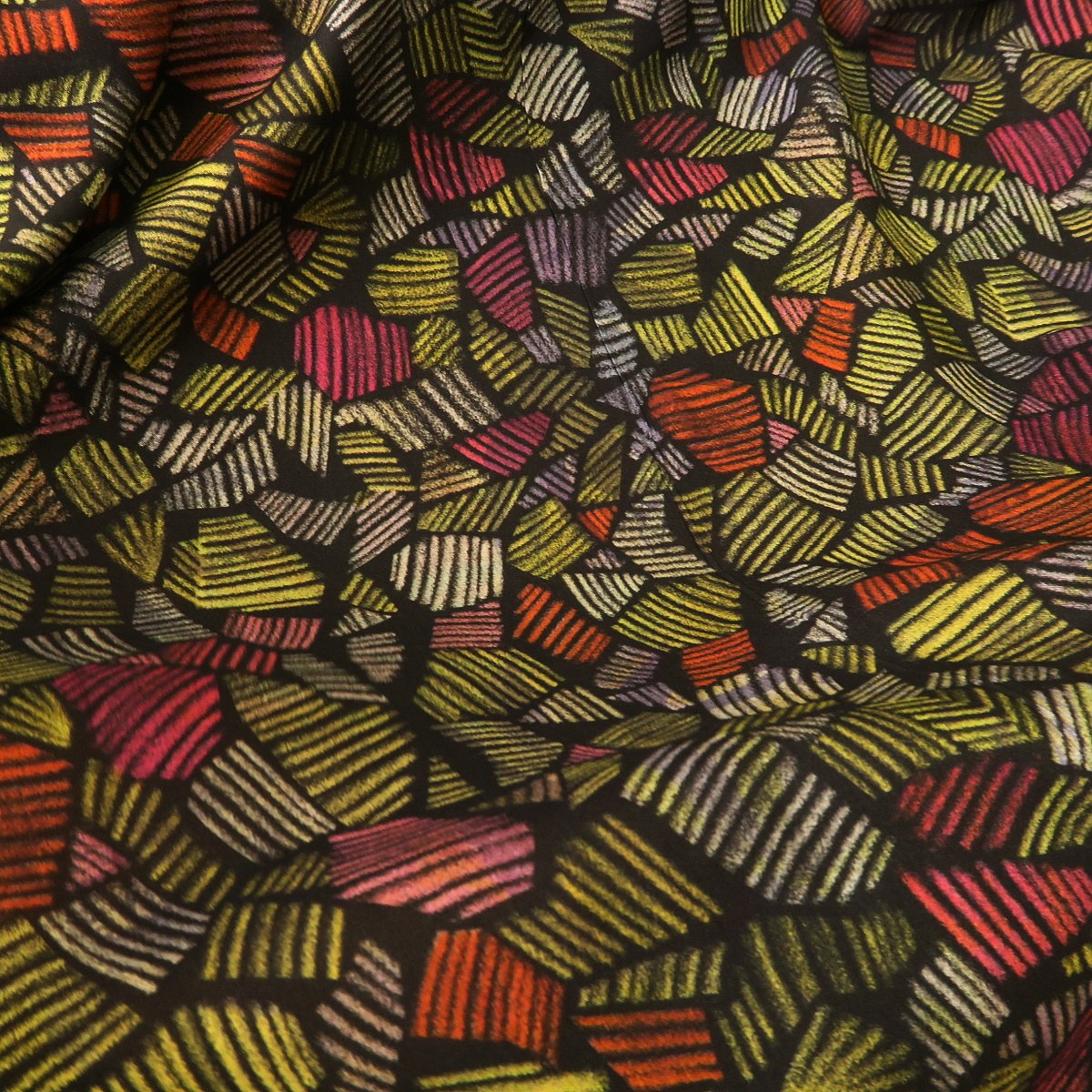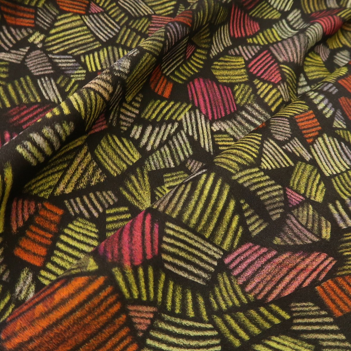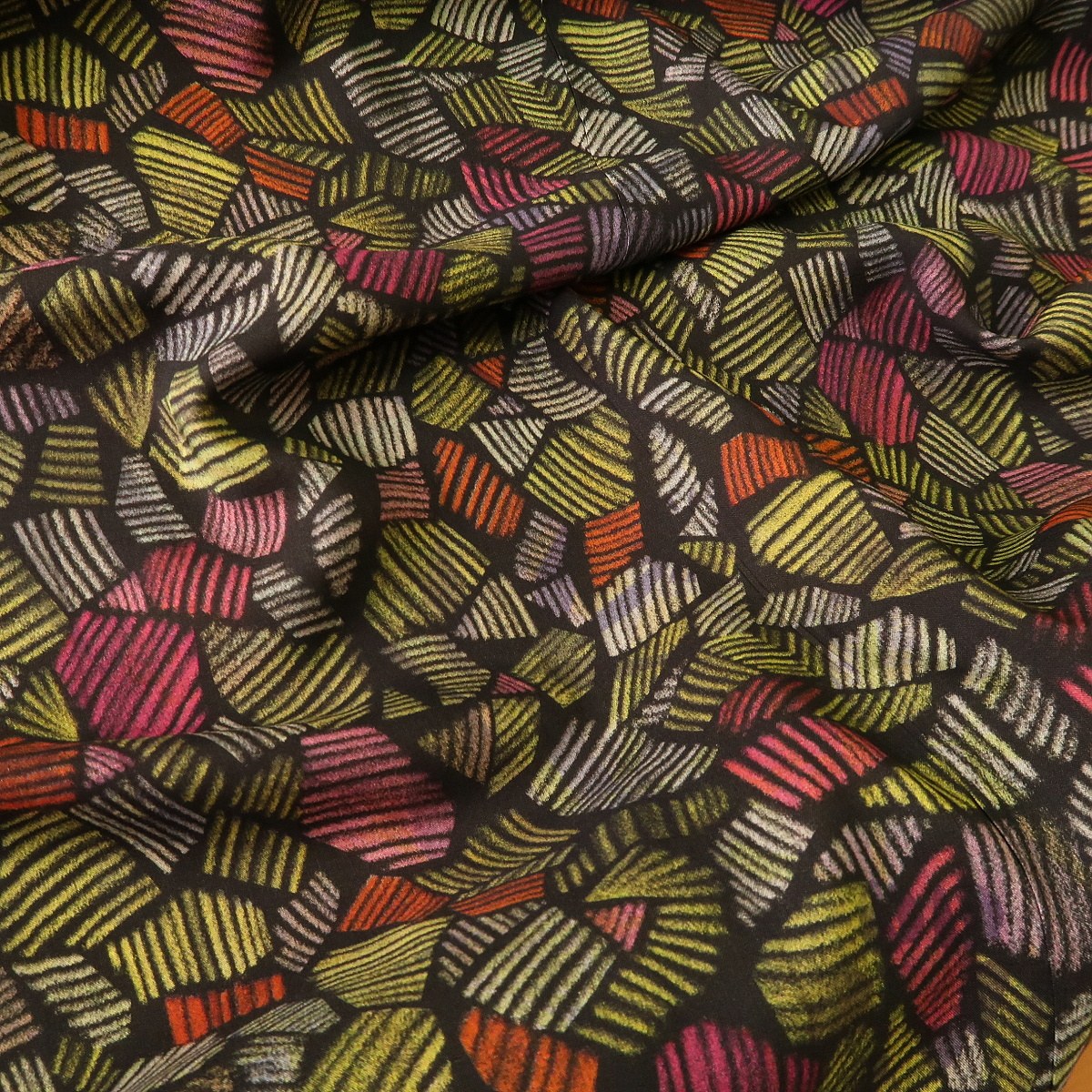 Plátno černé s geometrickým barevným vzorem viskózové je splývavá, košilová látka.