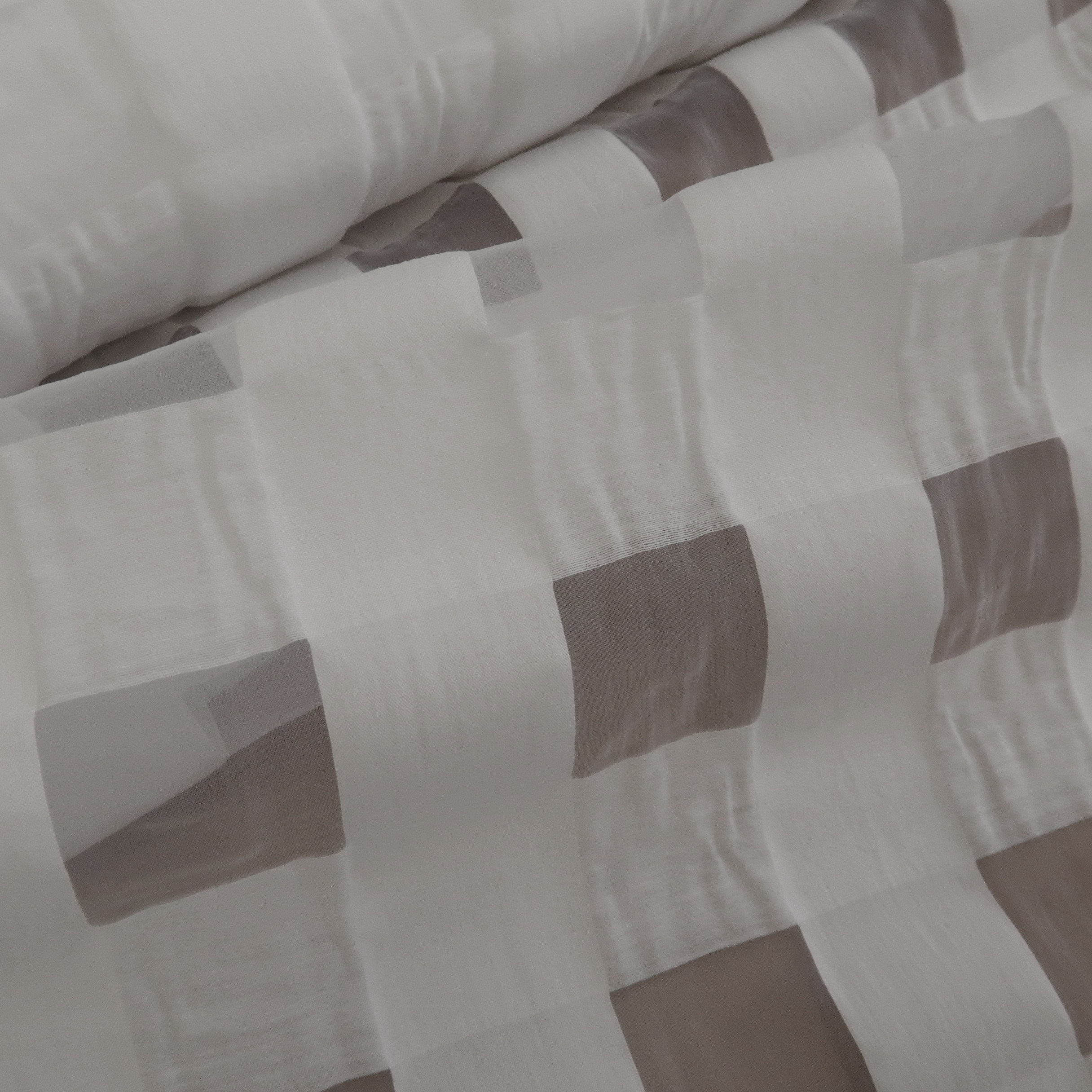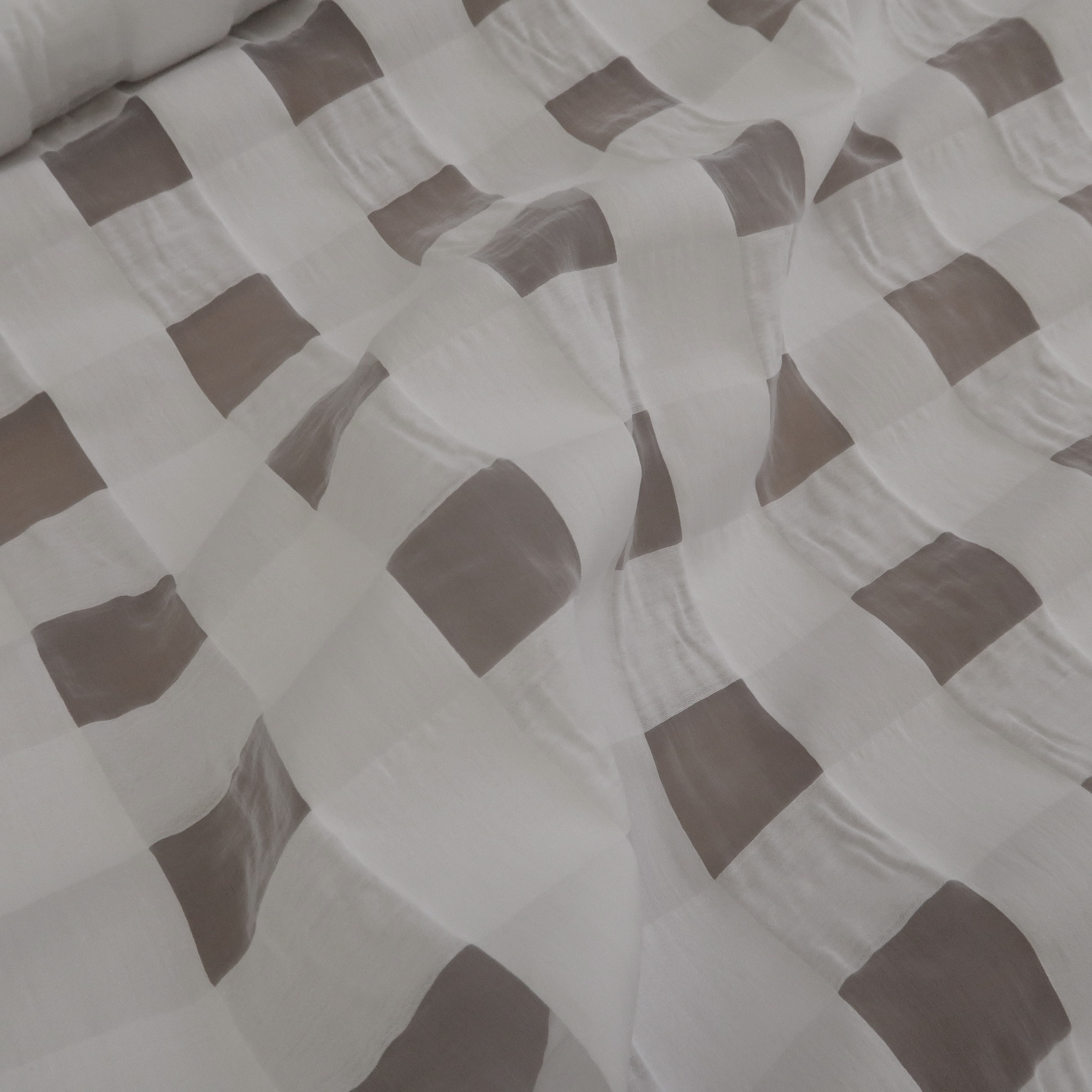 Plátno/organza bílá s čtvercovým vzorem je látka s průhlednými místy, které mají velikost cca 3,5×3,5 cm. Gramáž látky je cca 80 g/m2. Žehlit pouze přes plátno.
