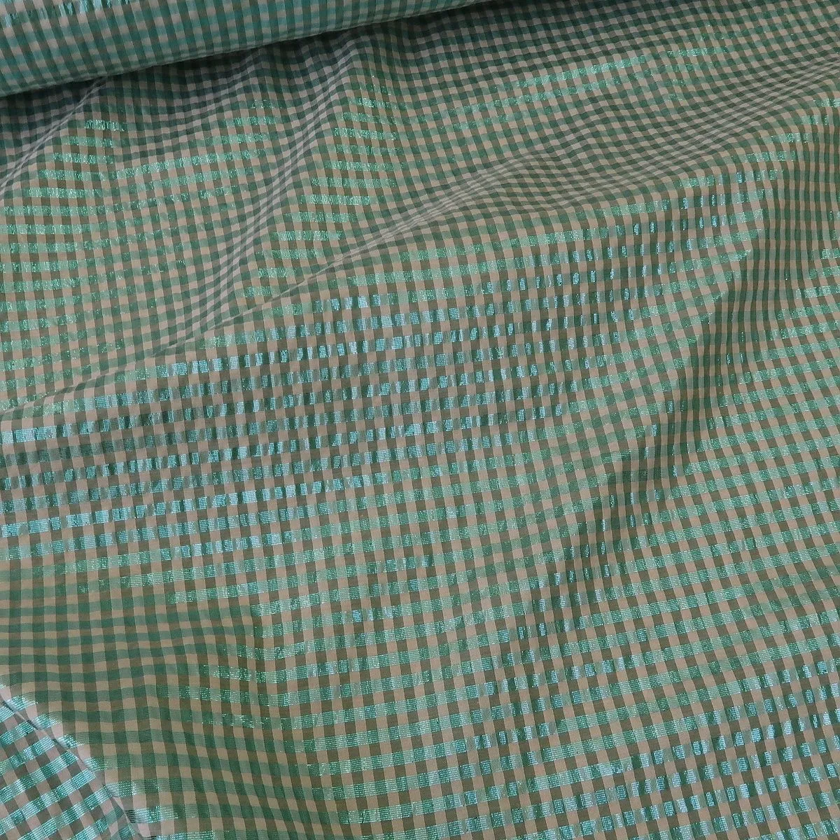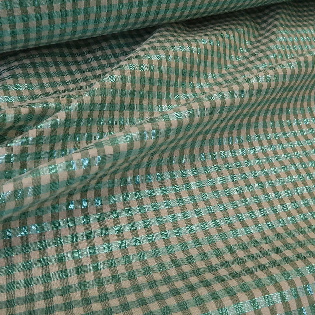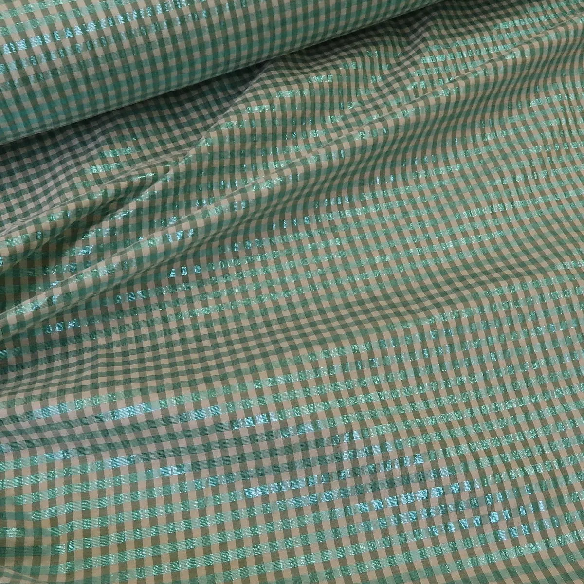 Plátno žakárové s drobnou bílo-tyrkysovou kostkou je lehká letní látka s vyšším leskem. Gramáž je cca 50 g/m2.