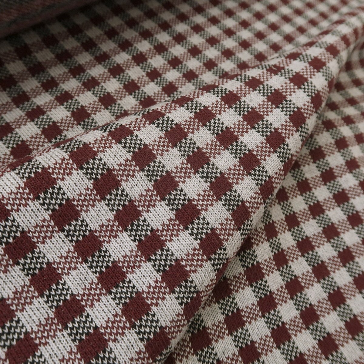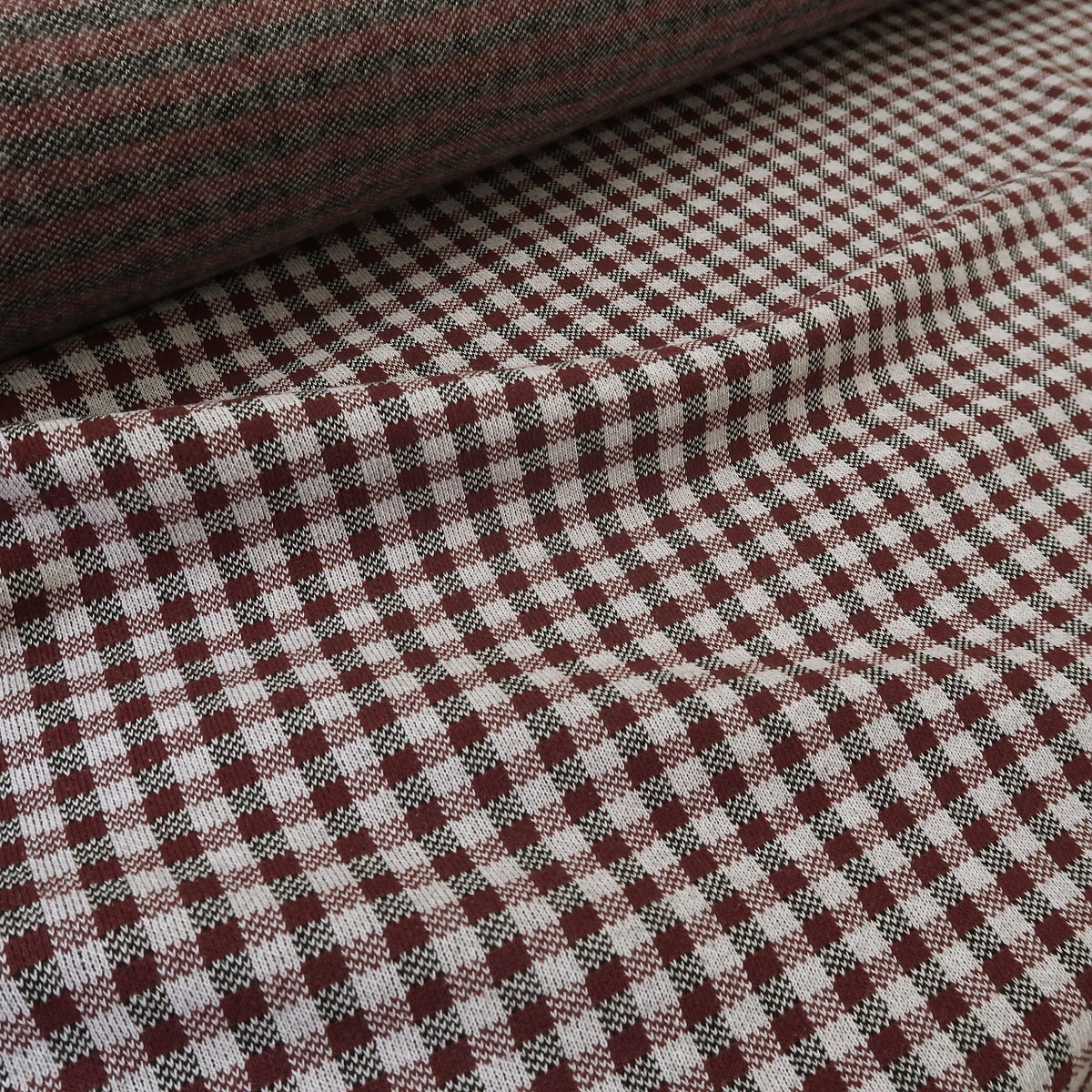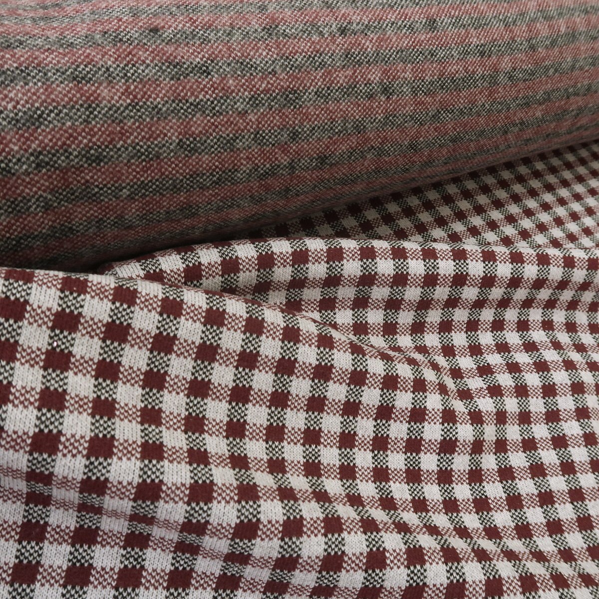 Pletenina s bílo-černo-vínovou kostkou je oboustranná látka. Z jedné strany má cca 1×1 cm velké káro, z druhé strany jsou 1 cm silné proužky.