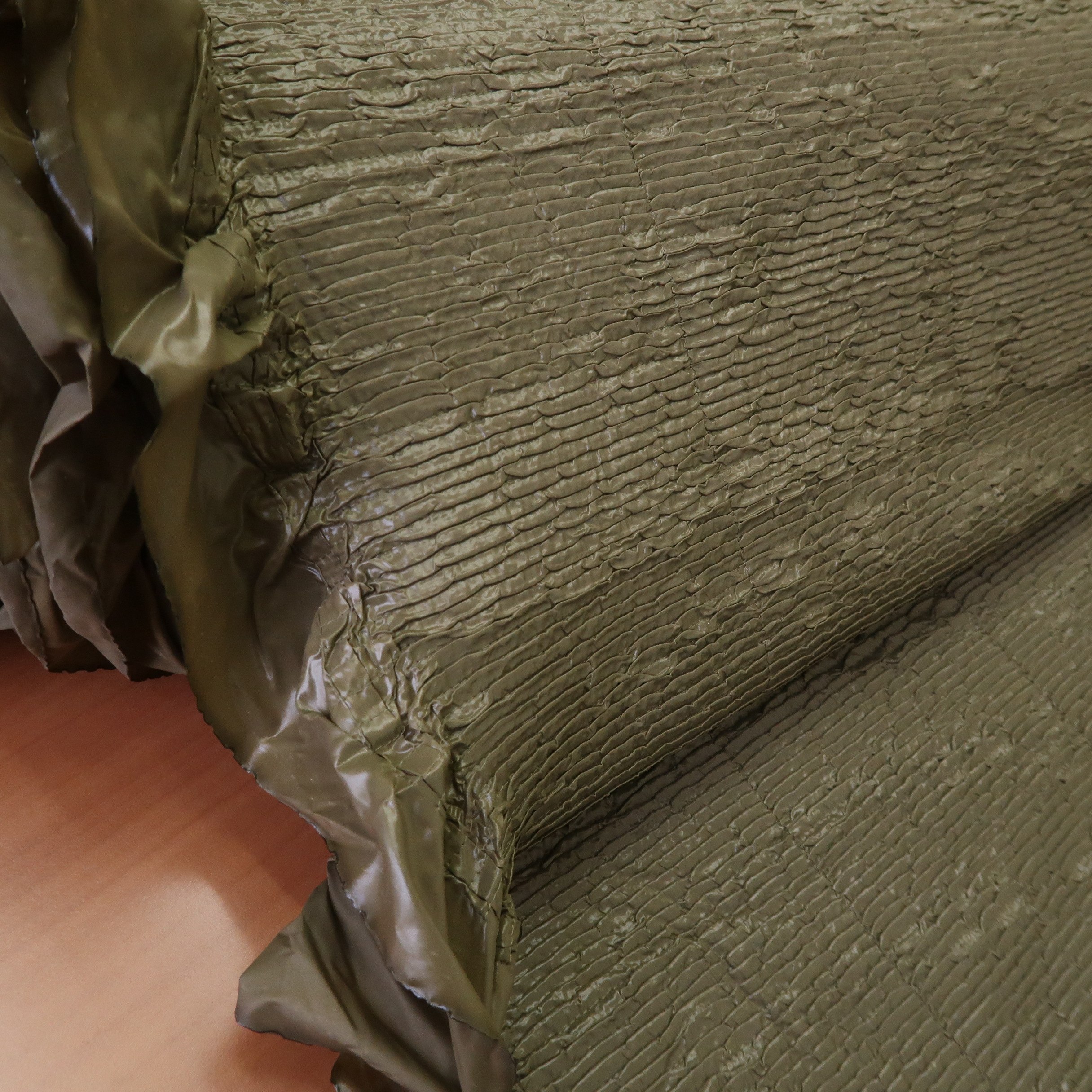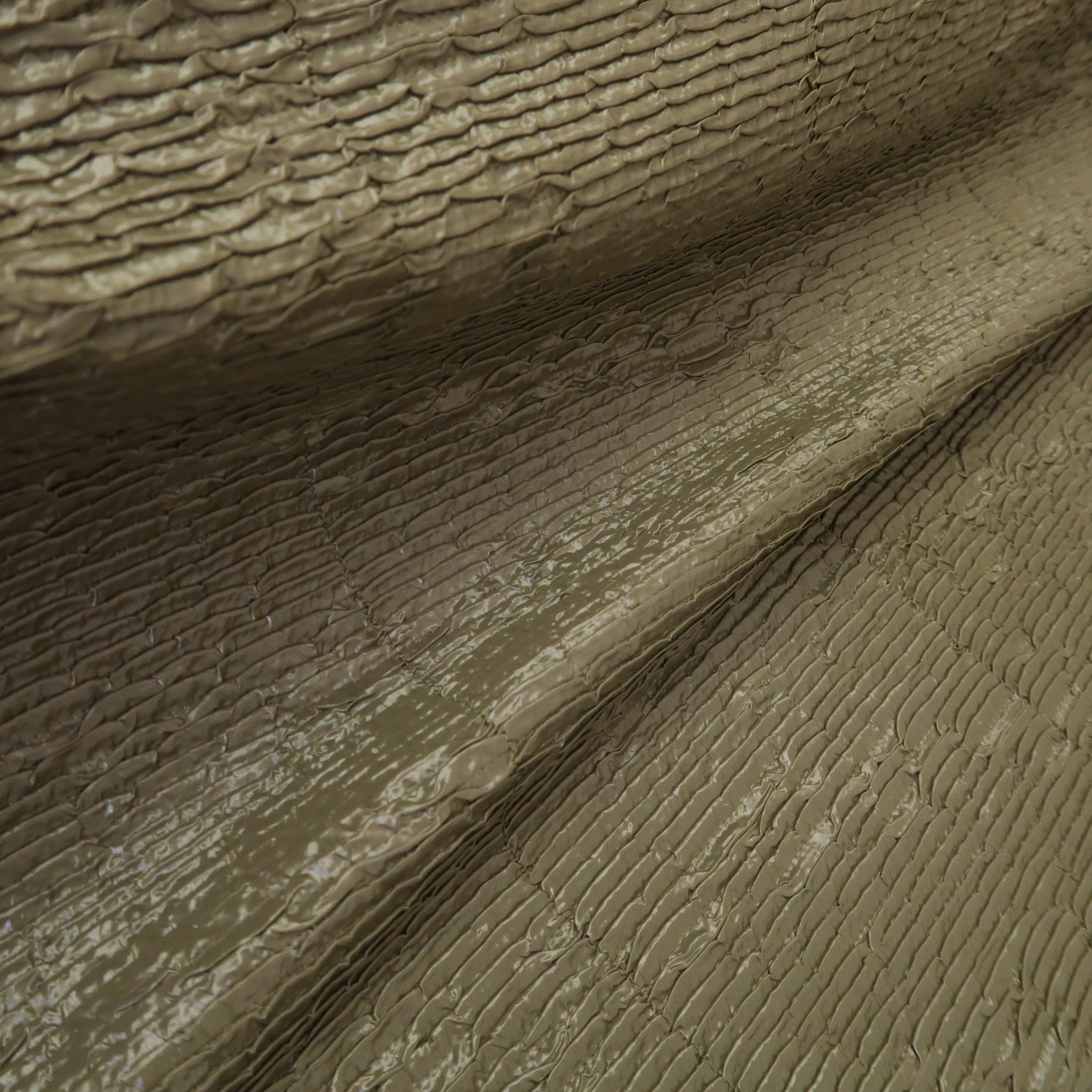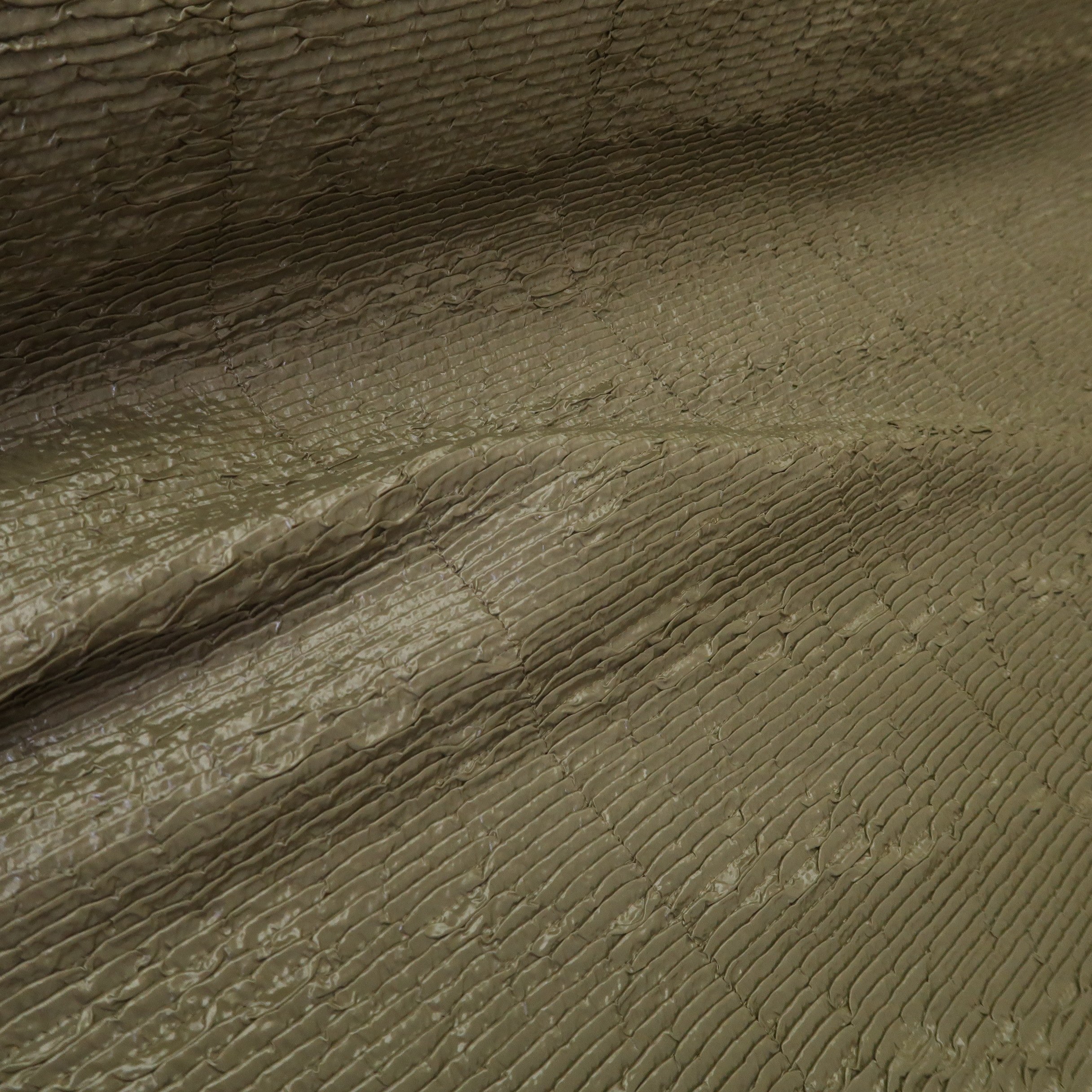 Prošev khaki zelený je velmi pružná látka vhodná i na uplejší bundičky. Vrchní materiál tvoří lesklá šusťákovina. Gramáž je cca 280 g/m2.