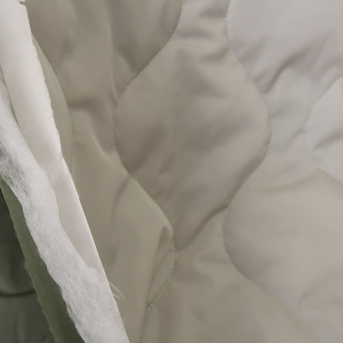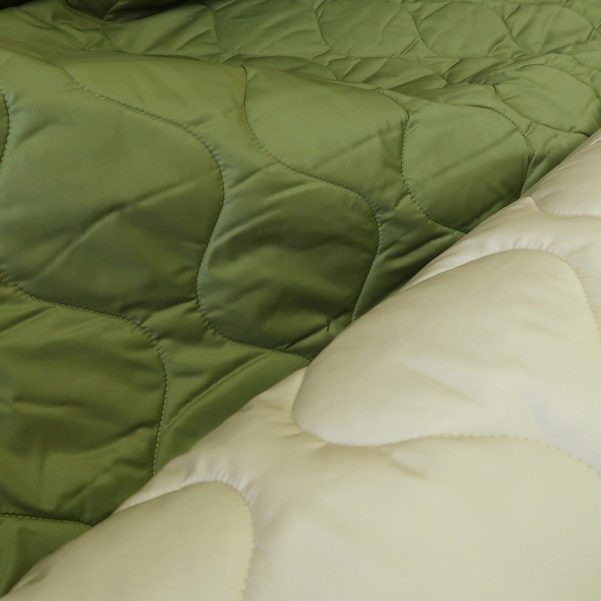Prošev zelený/slonová kost double je oboustranná látka. Mezi dvěmi šusťákovinami je měkký vatelín.