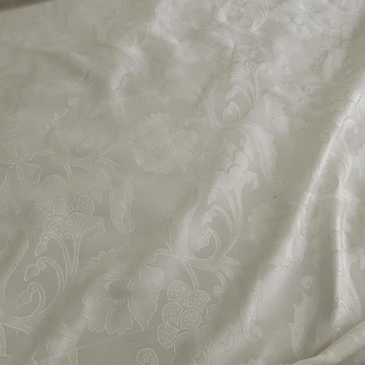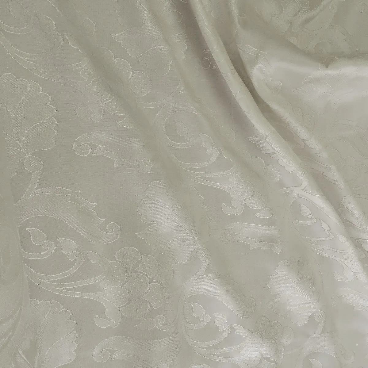 Šantung bílý s žakárovým vzorem á la damašek je látka lehká, tenká, ale držící tvar. Gramáž je cca 95 g/m2.