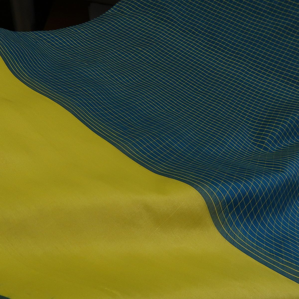 Žlutá část na látce měří cca 15 cm. Kostkovaný prostor mezi žlutými pruhy má cca 180 cm.