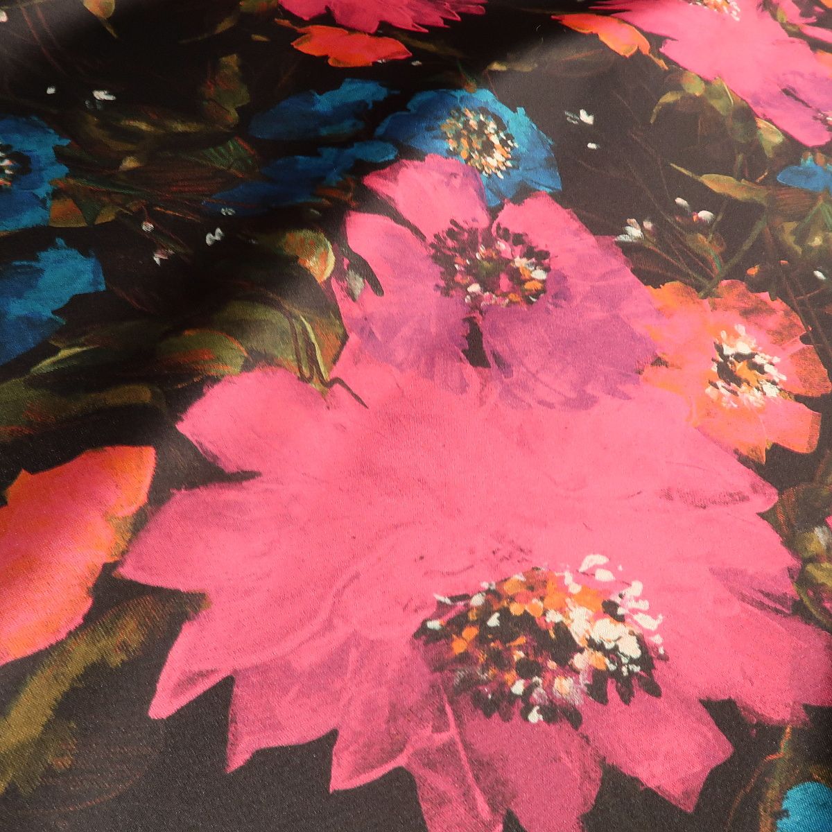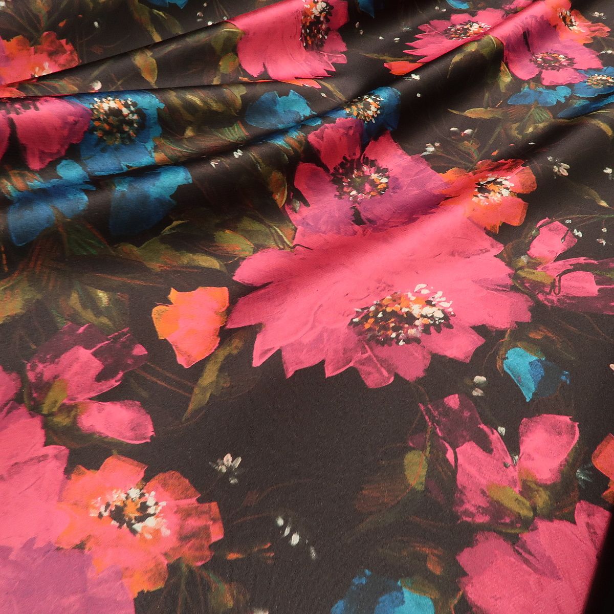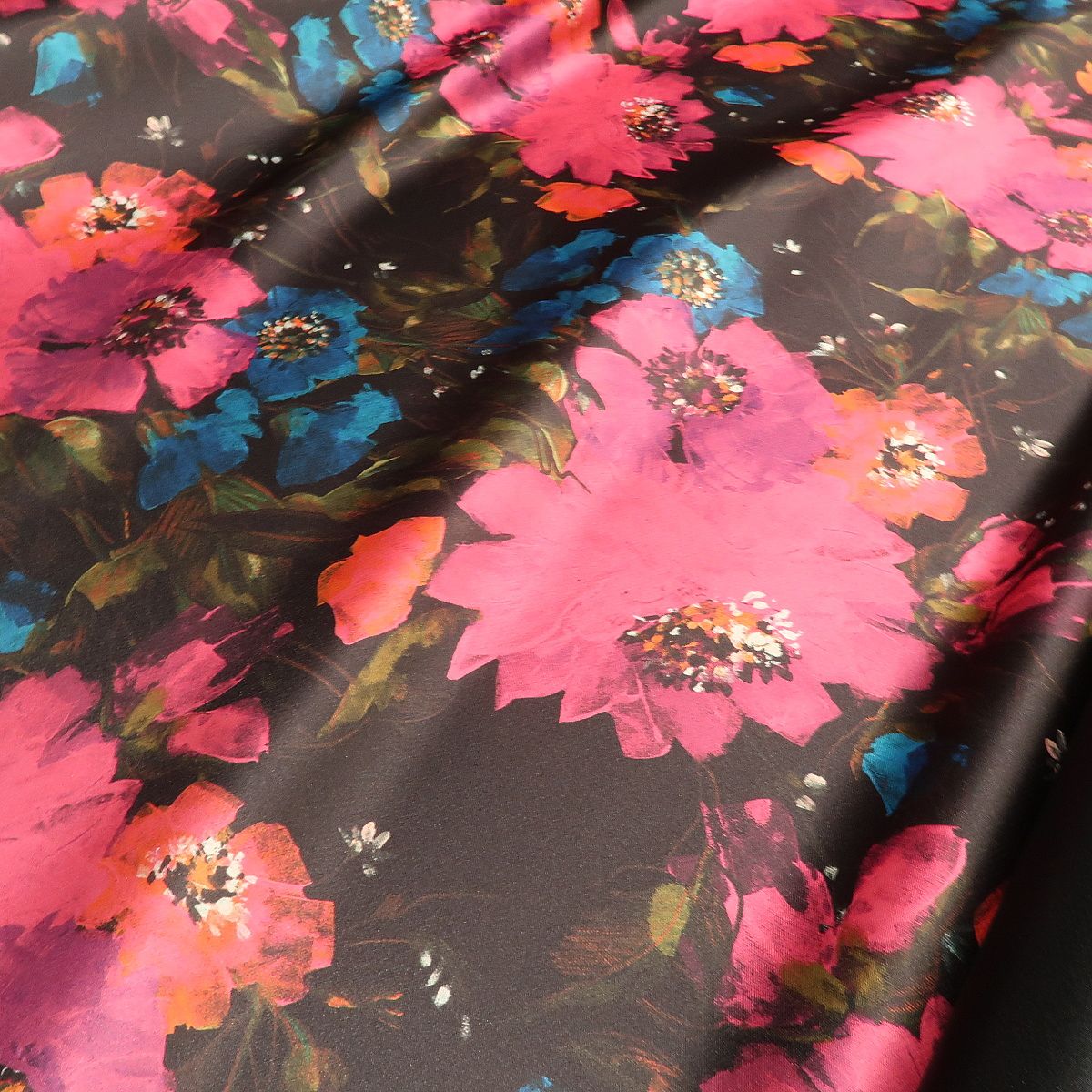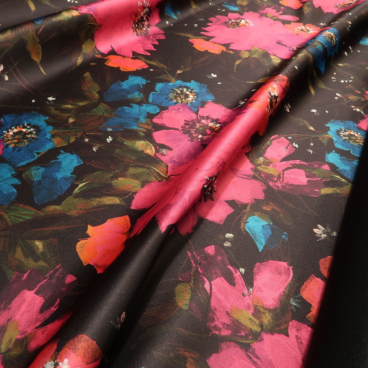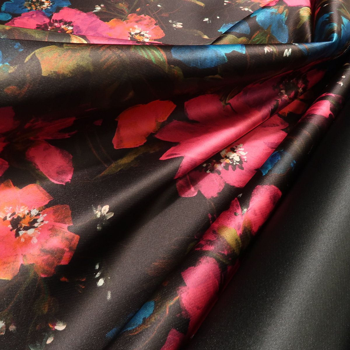 Satén černý s velkými ciklámovými květy double je tuhší látka, která krásně drží tvar a přitom má hezký měkký lom. Z jedné strany je pouze hladká černá a z druhé strany má vzor velkých květů. Gramáž je cca 300 g/m2.