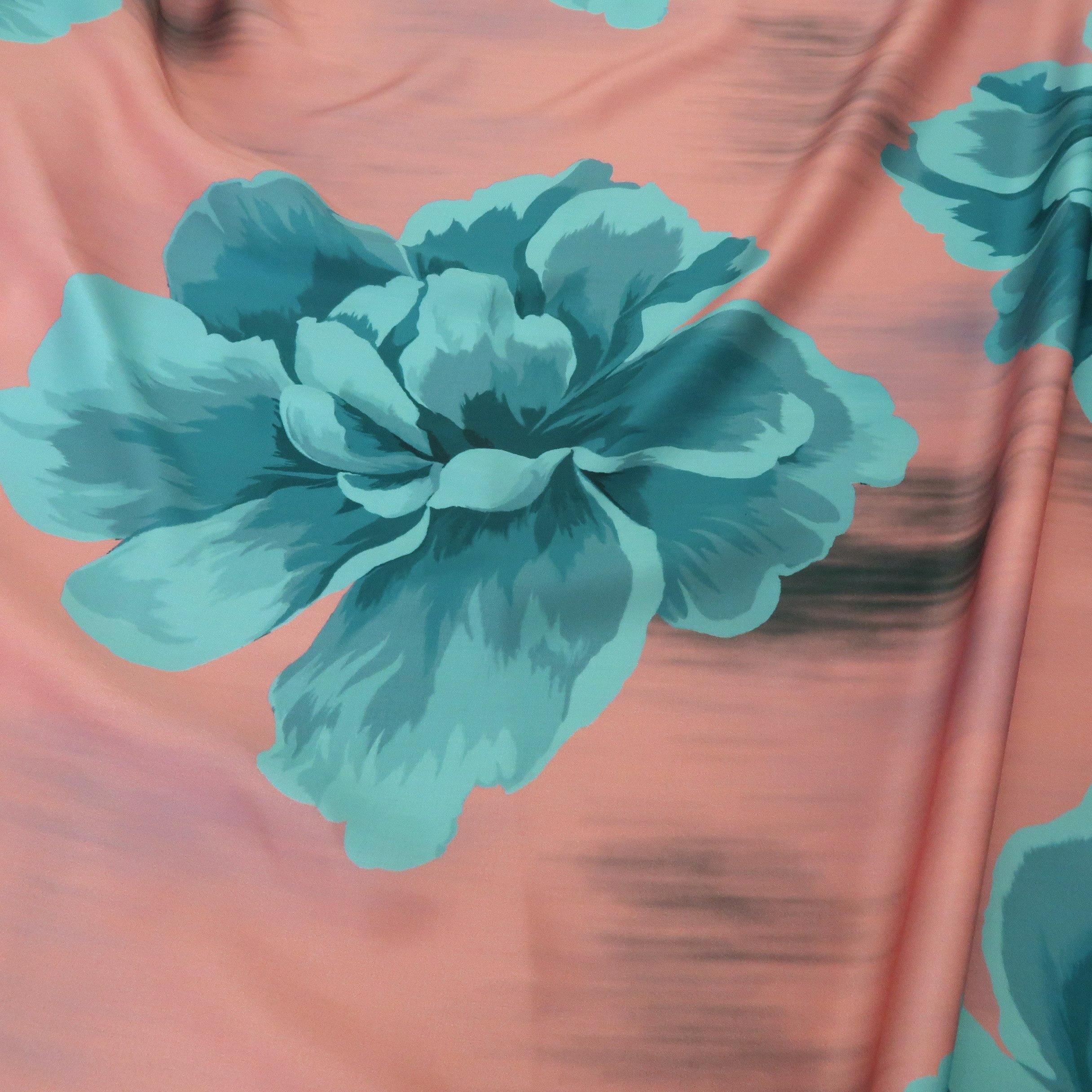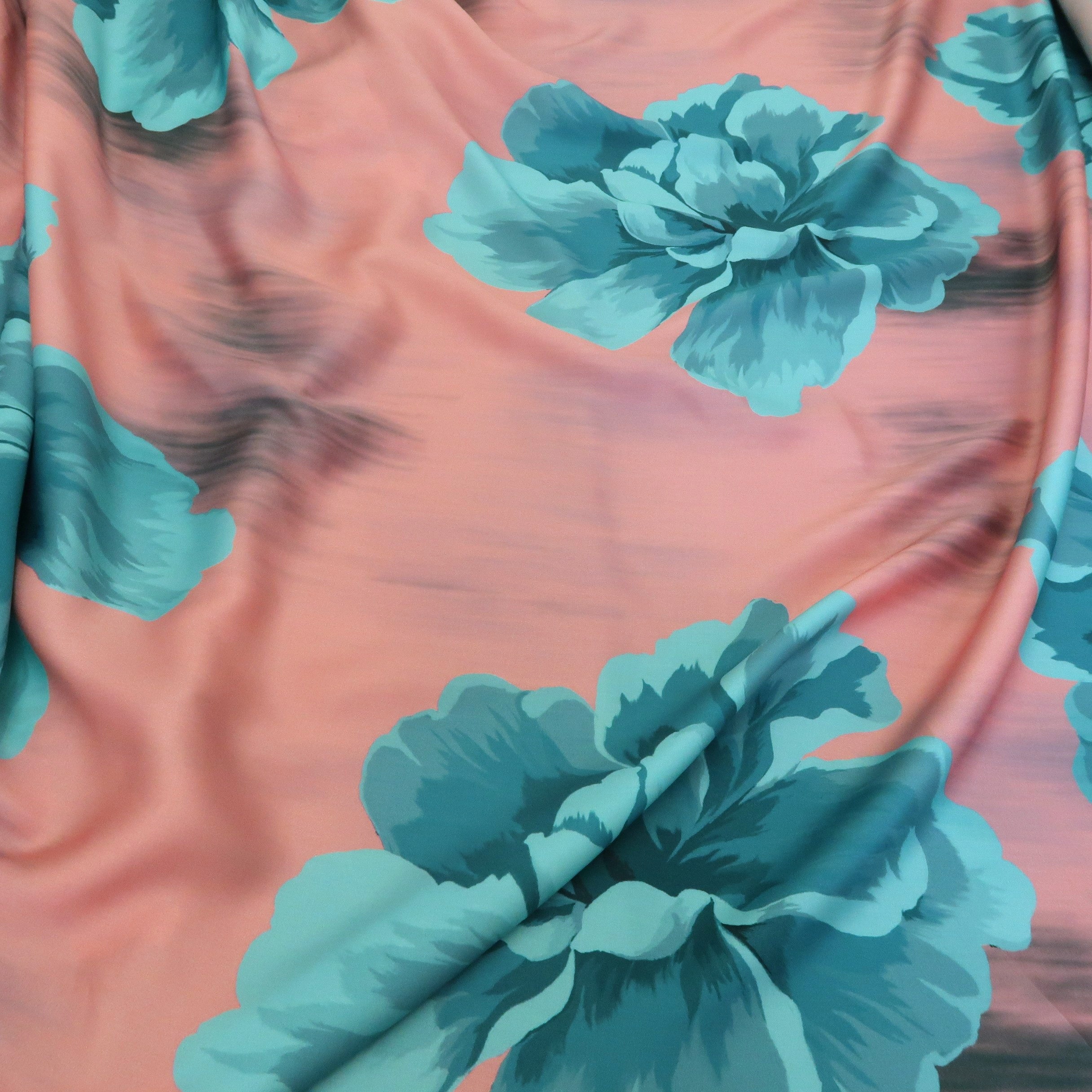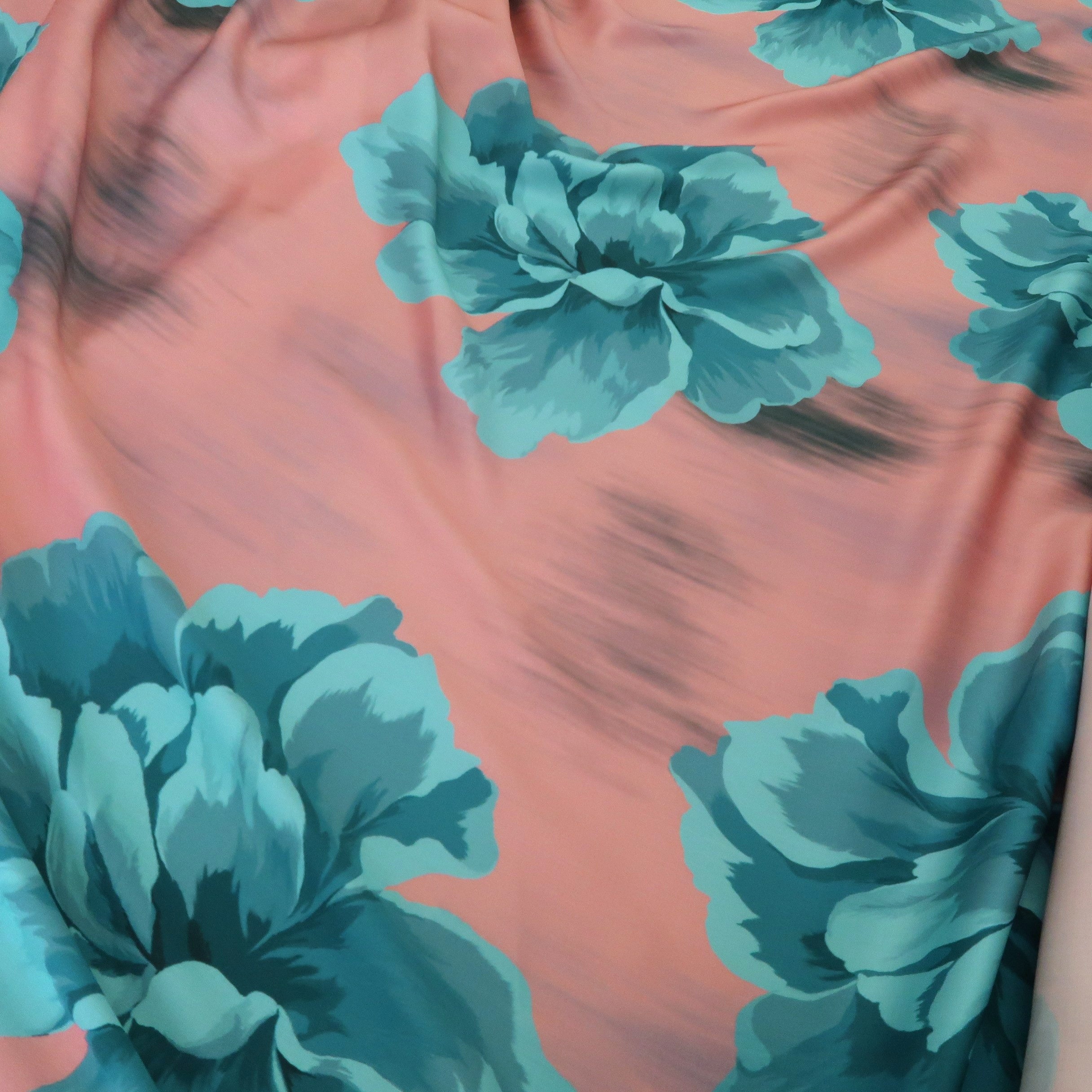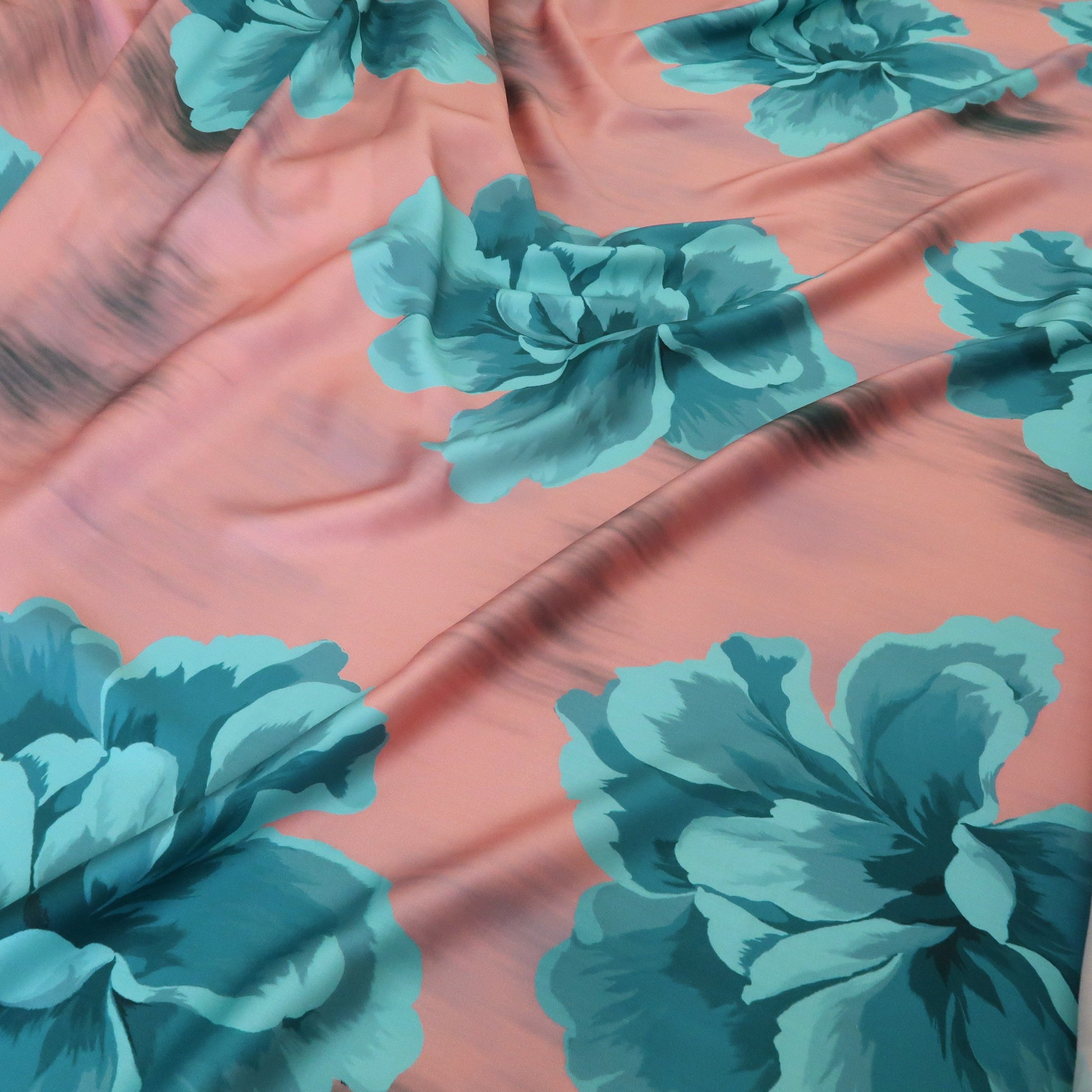 Satén růžový s tyrkysovými květy je lehká letní, splývavá látka o gramáži cca 100 g/m2. Květ má velikost cca 40 cm.