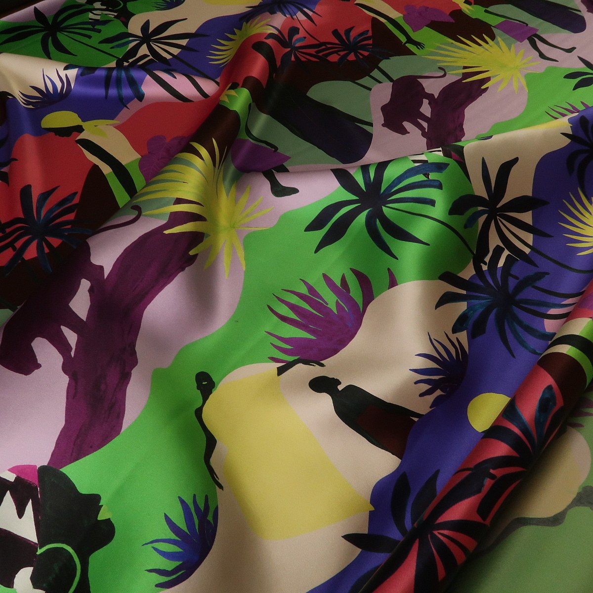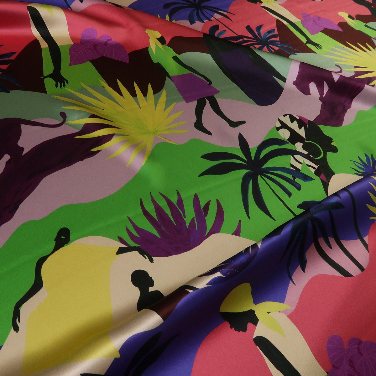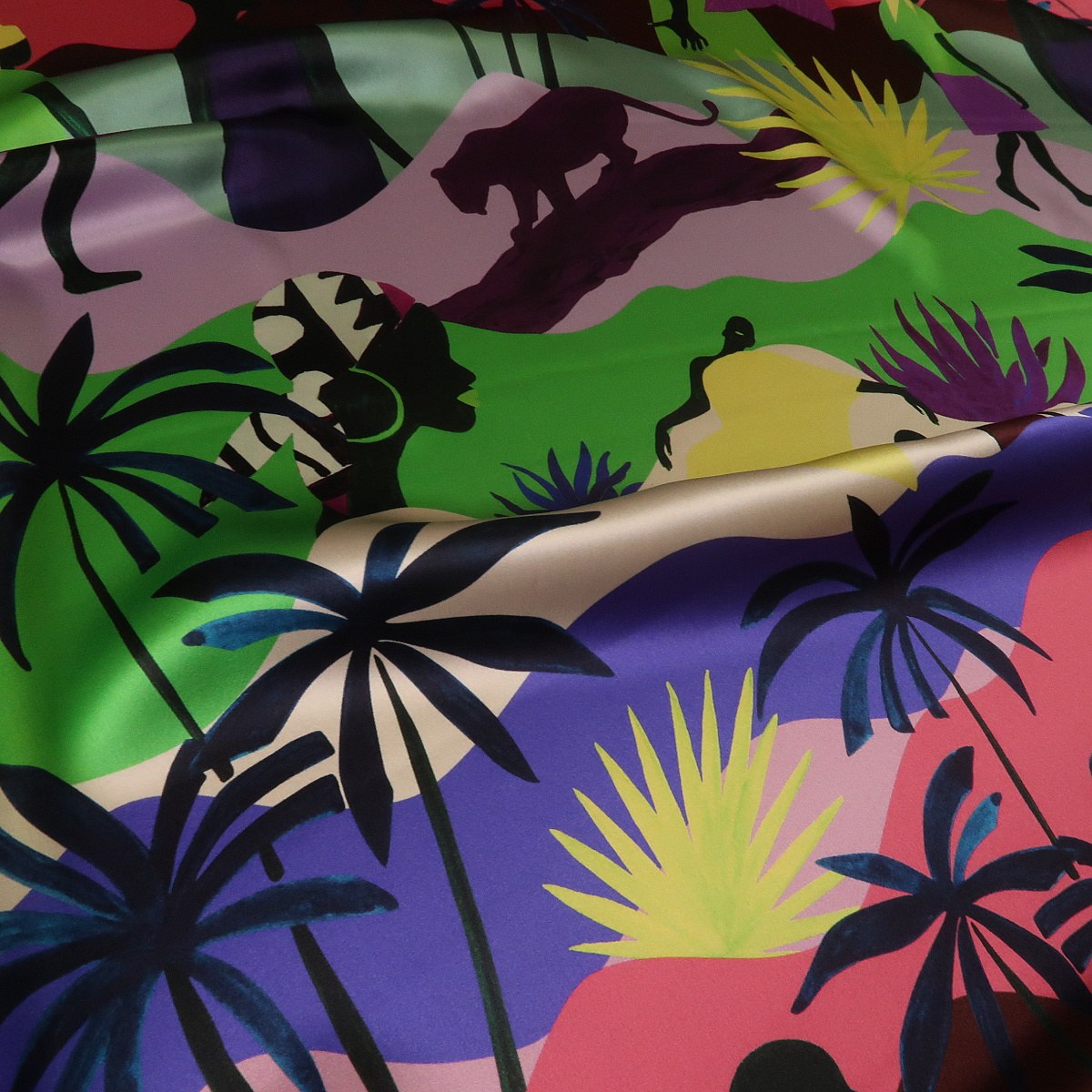 Satén s barevným fialovo-žluto-zeleným africkým vzorem