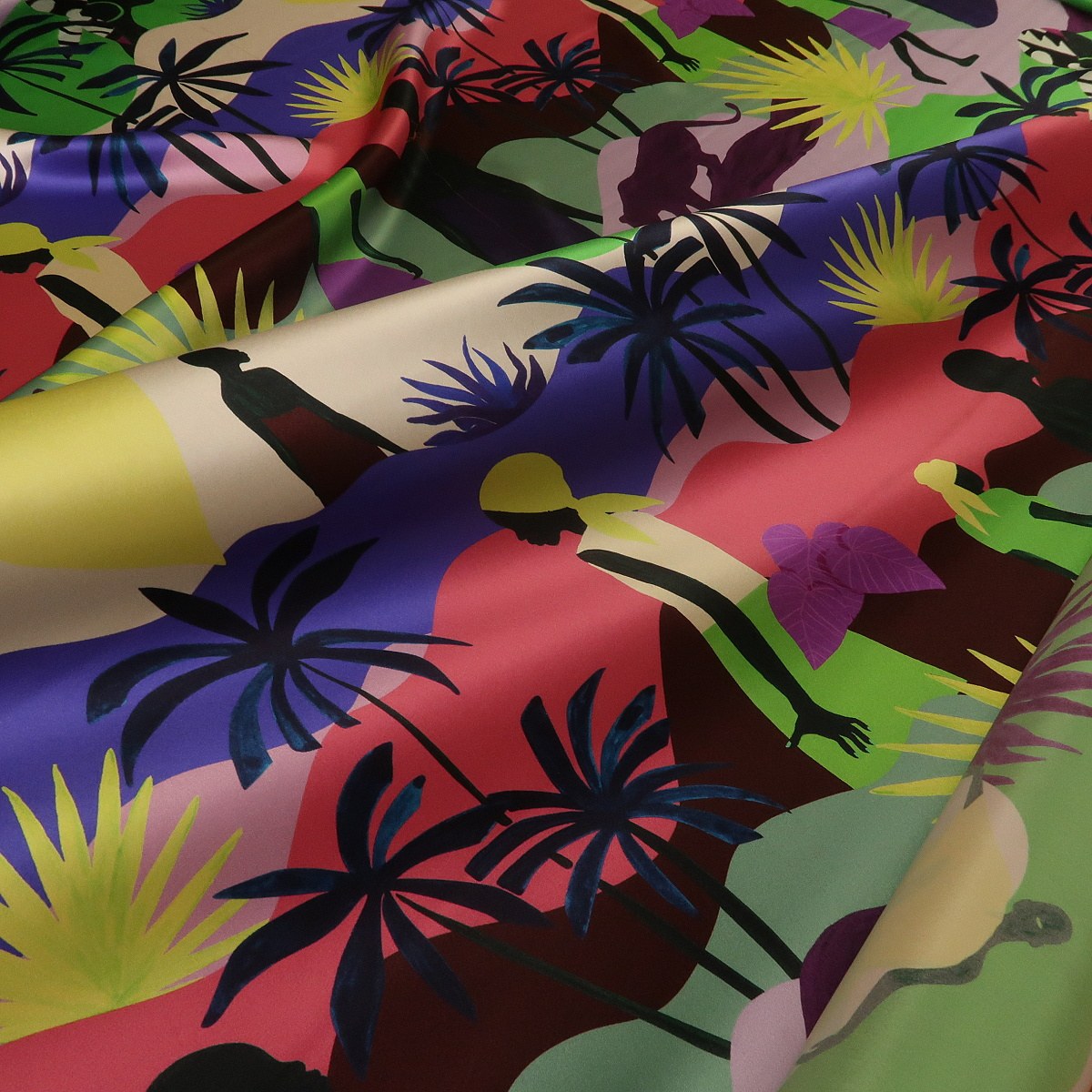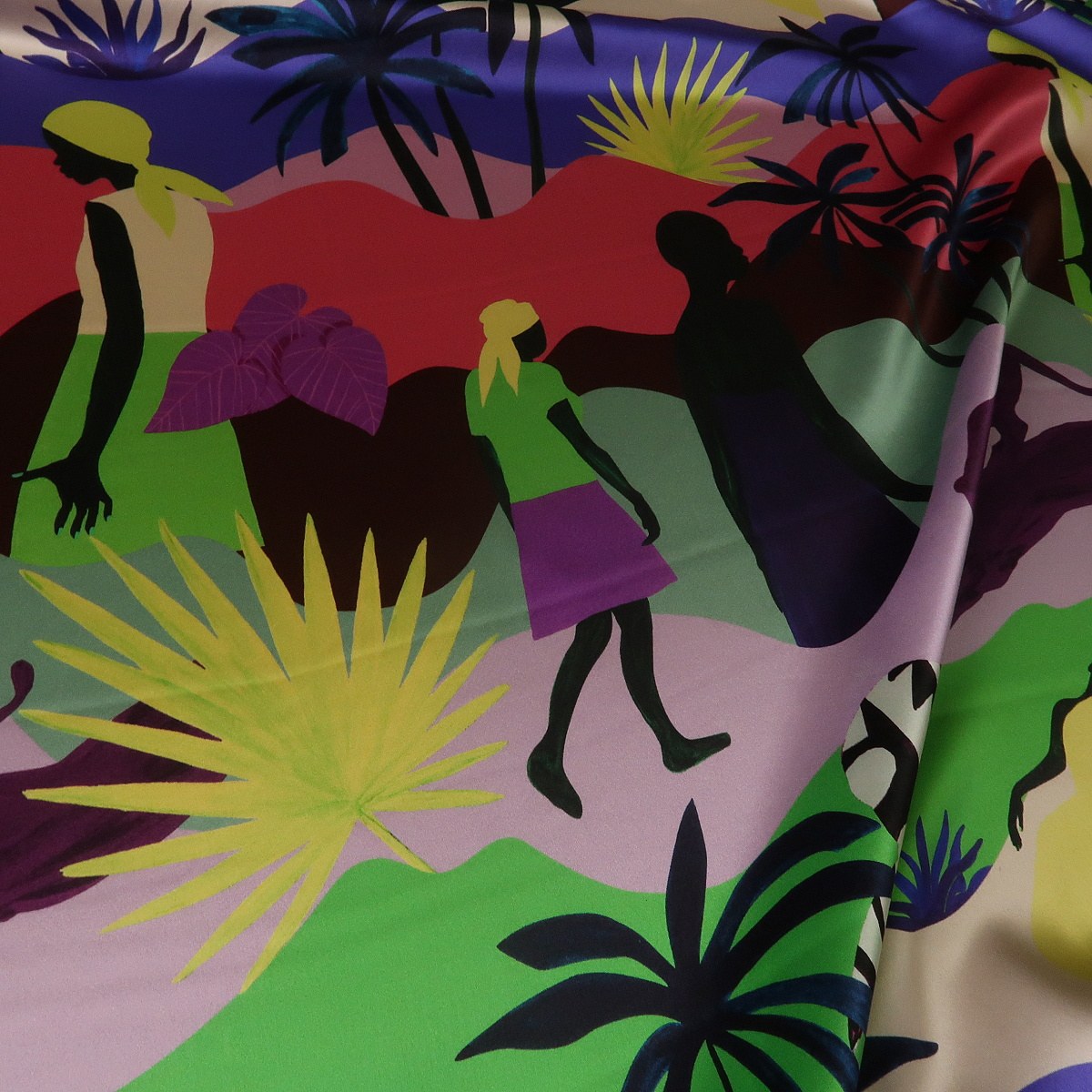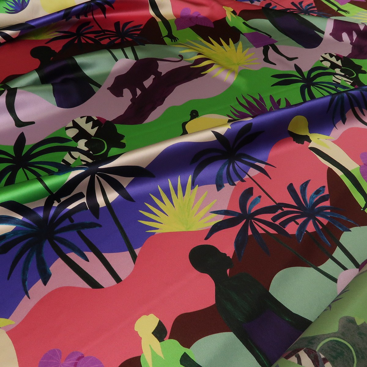 Satén s barevným fialovo-žluto-zeleným africkým vzorem