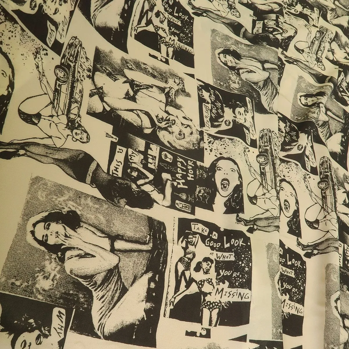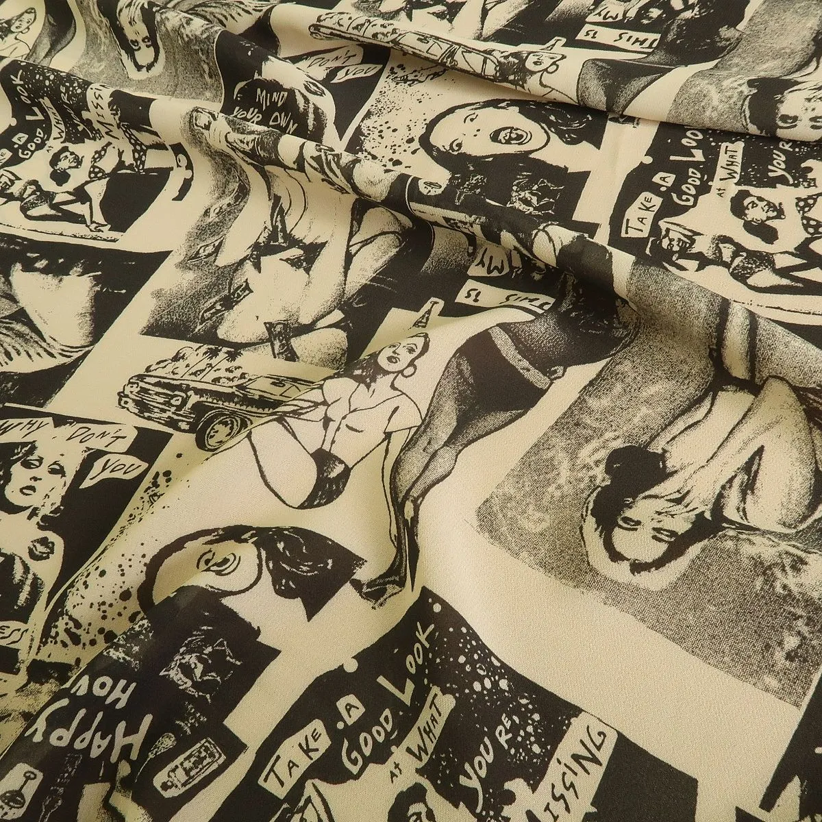 Šifon bílý s černým komiksovým vzorem je lehoučká, poloprůsvitná látka o gramáži cca 50 g/m2.