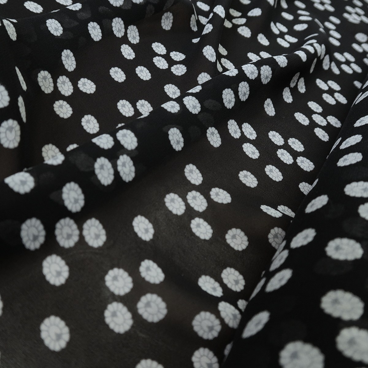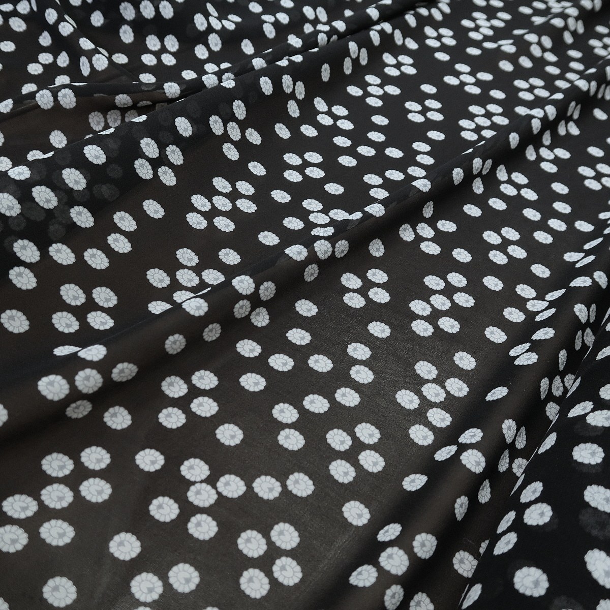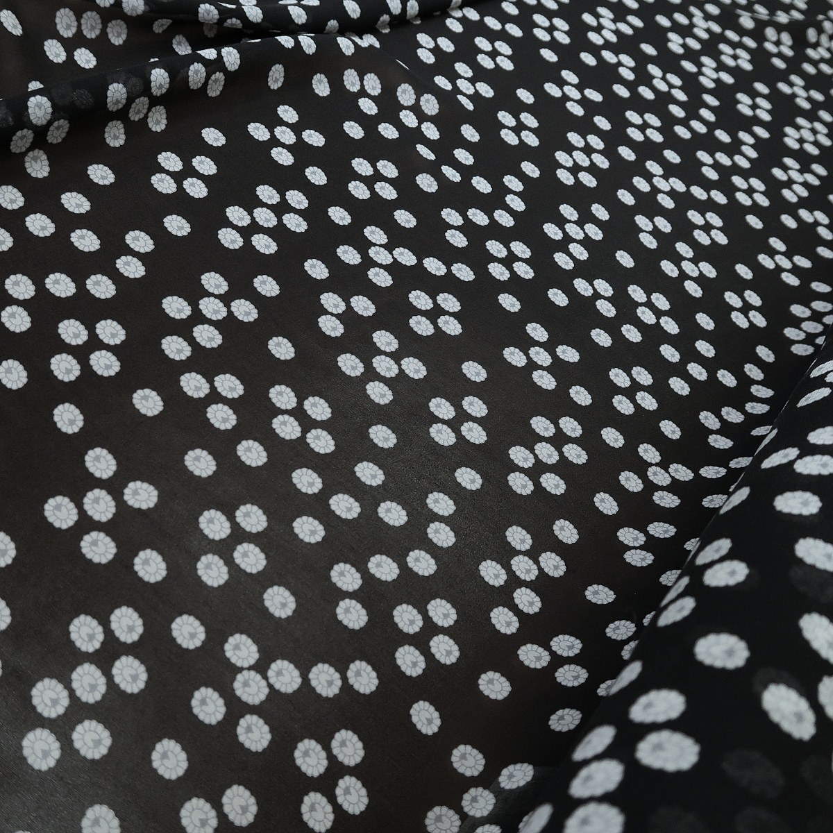Šifon černý s dobným světlým vzorem hedvábný je lehká, průsvitná látka o gramáži cca 30 g/m2. Průměr „puntíků“ je 1 cm.