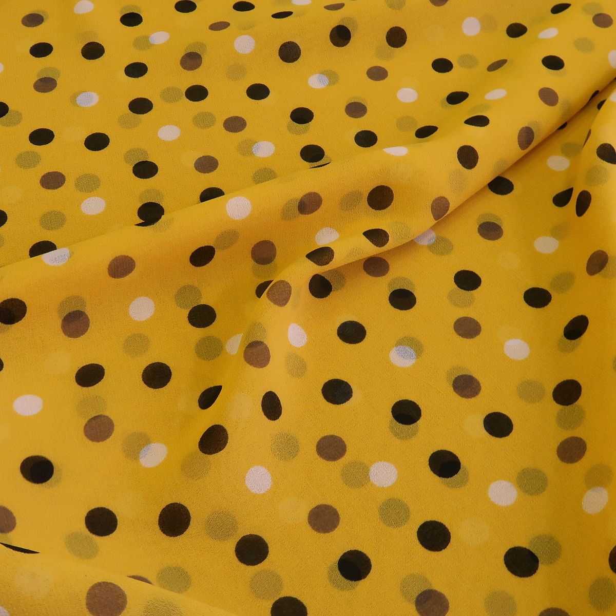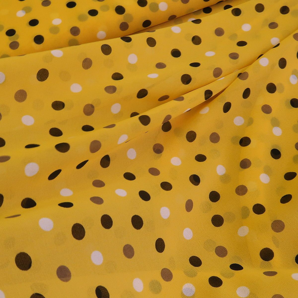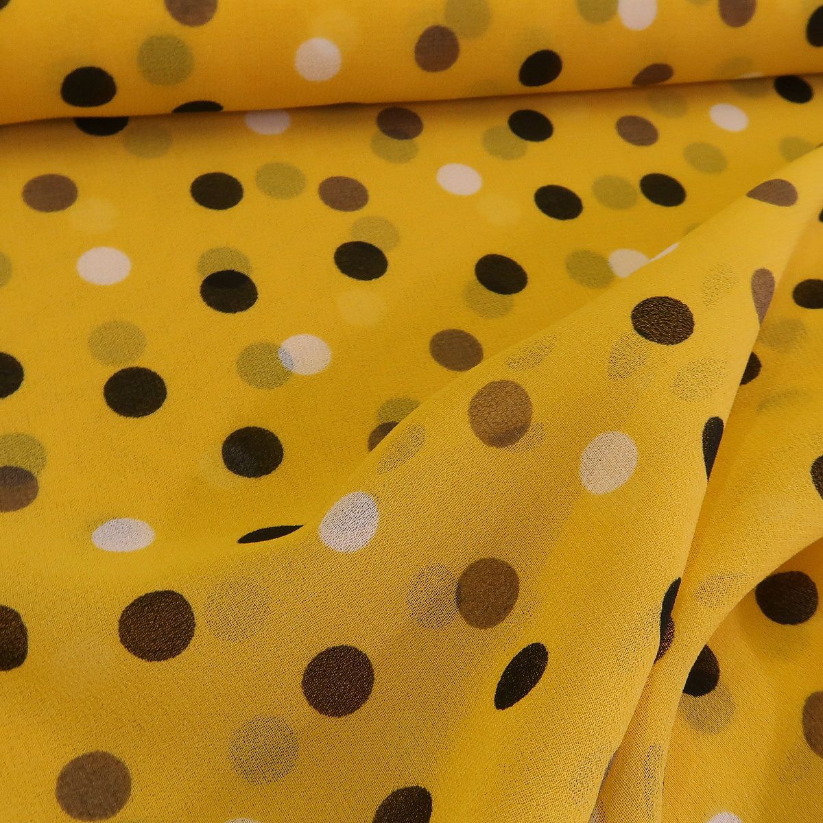 Šifon žlutý s černými a bílými puntíky je průhledná, splývavá látka. Puntíky mají průměr asi 0,9 cm a gramáž látky je cca 50 g/m2.