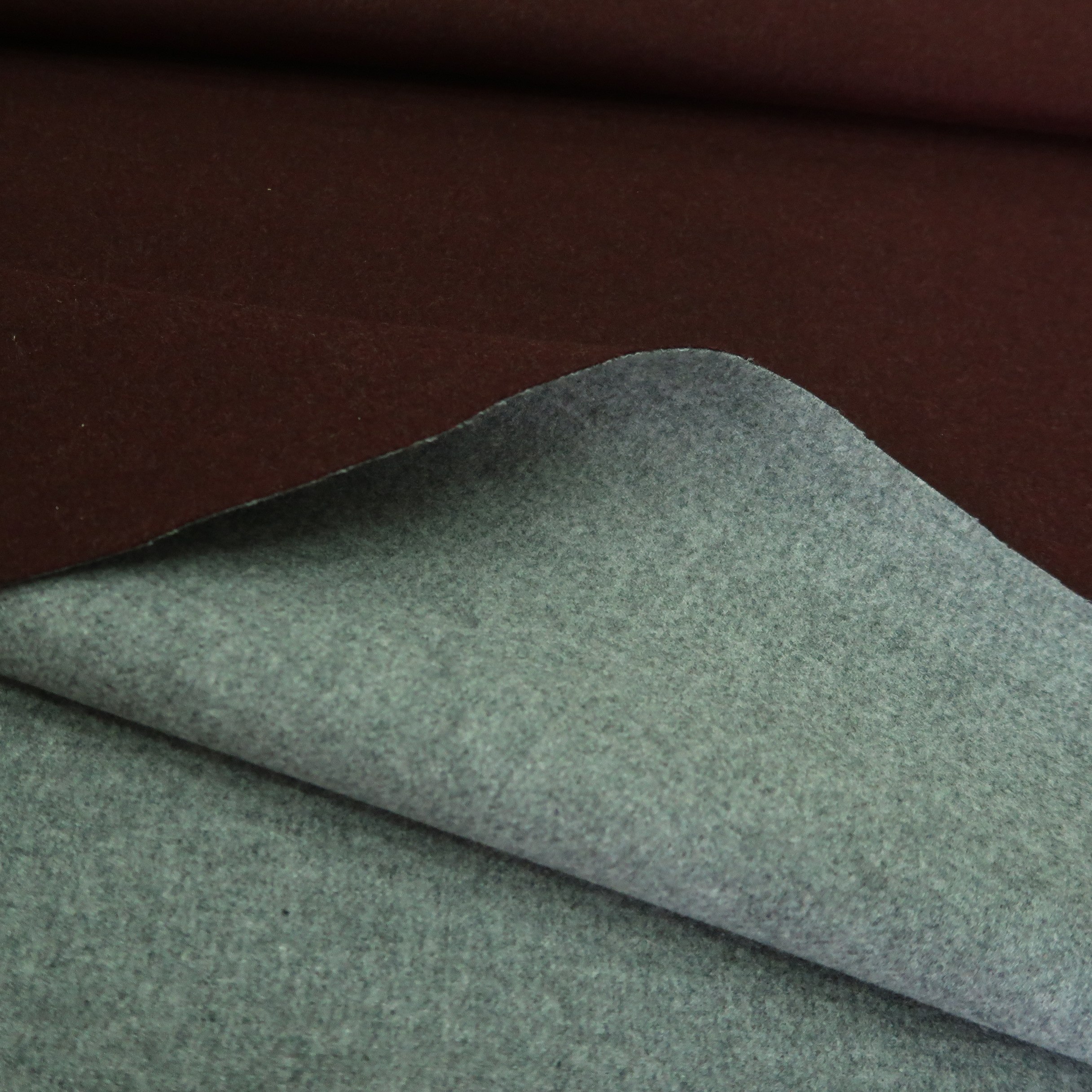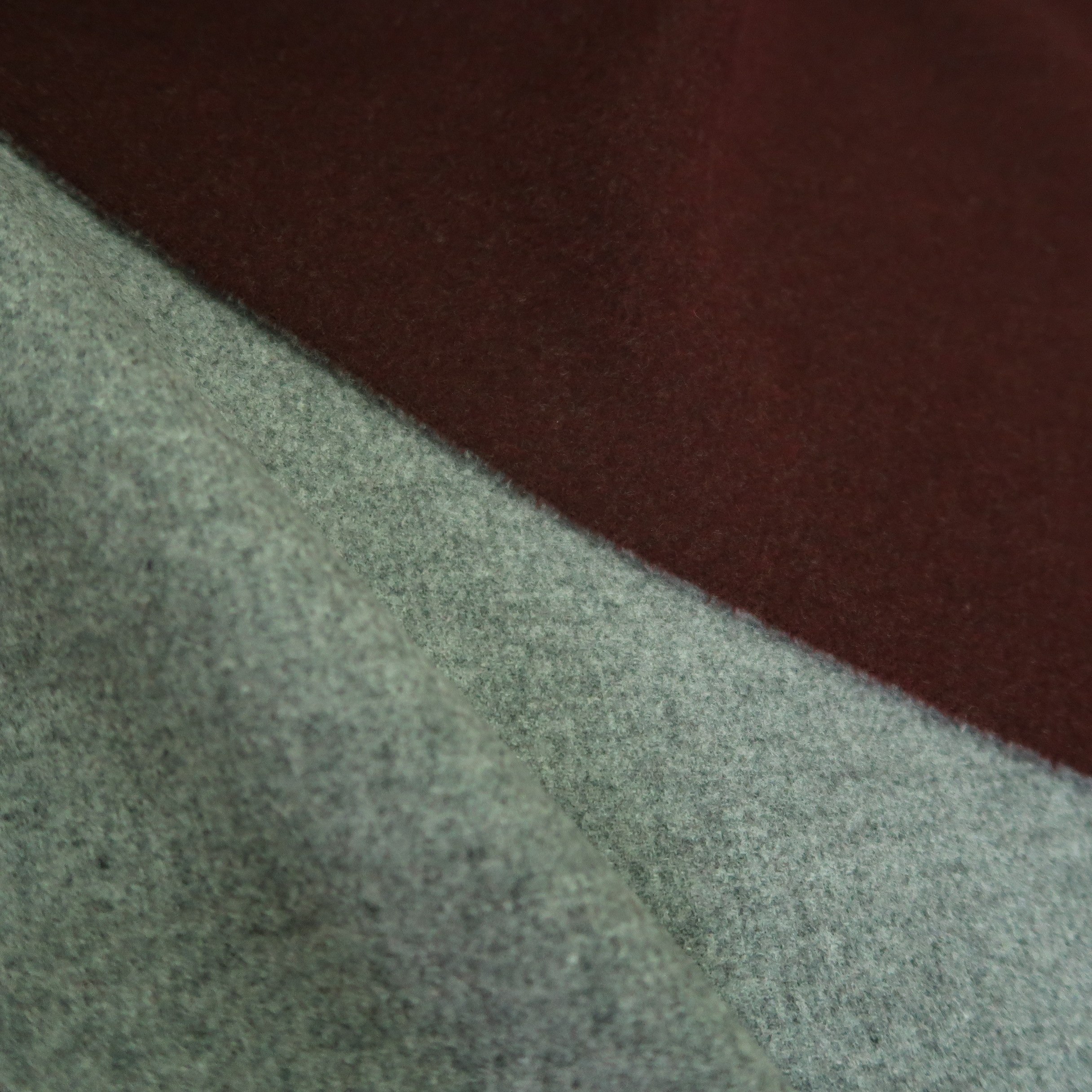 Sukno šedo-hnědé double je oboustranná látka. Z jedné strany je čokoládově hnědá, z druhé je šedá. Díky kašmíru je velmi jemná na omak. Gramáž je cca 500 g/m2.