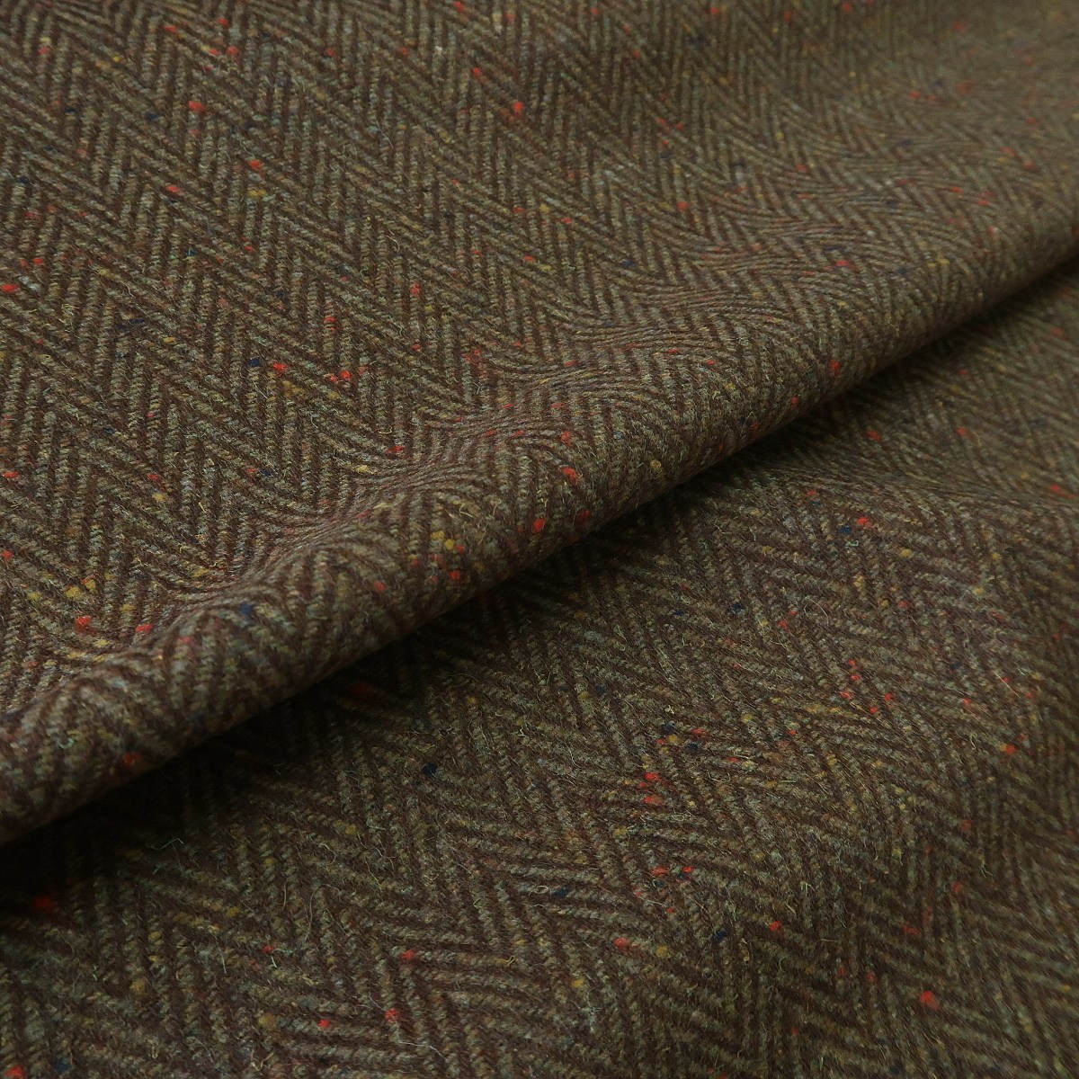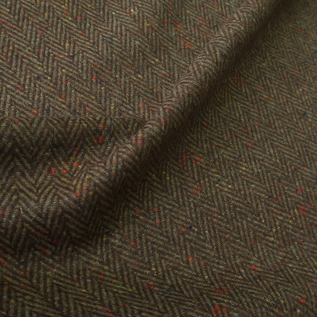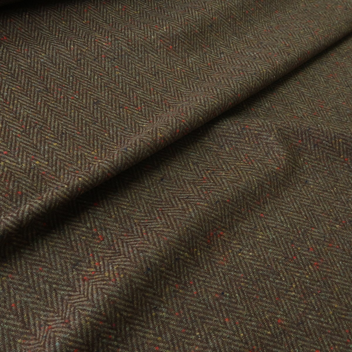 Tvíd khaki zelený s hnědou rybí kostí je slabší kabátová vlněná látka o gramáži cca 330 g/m2. Je vhodná na saka, bundy nebo zimní sukně.