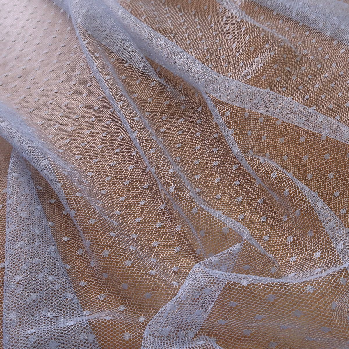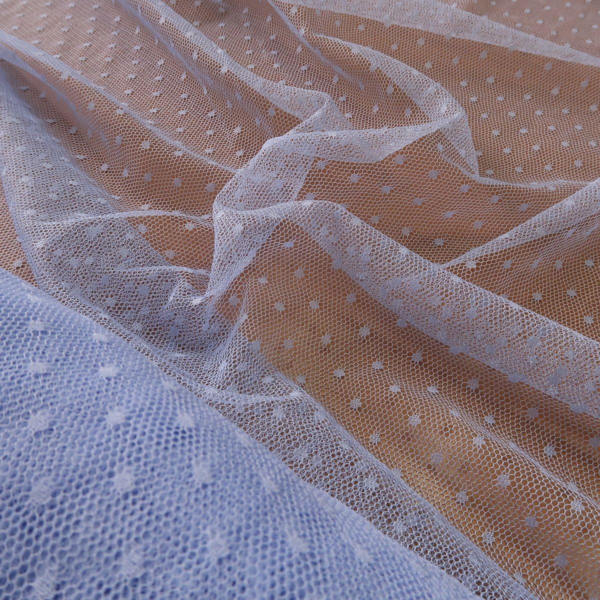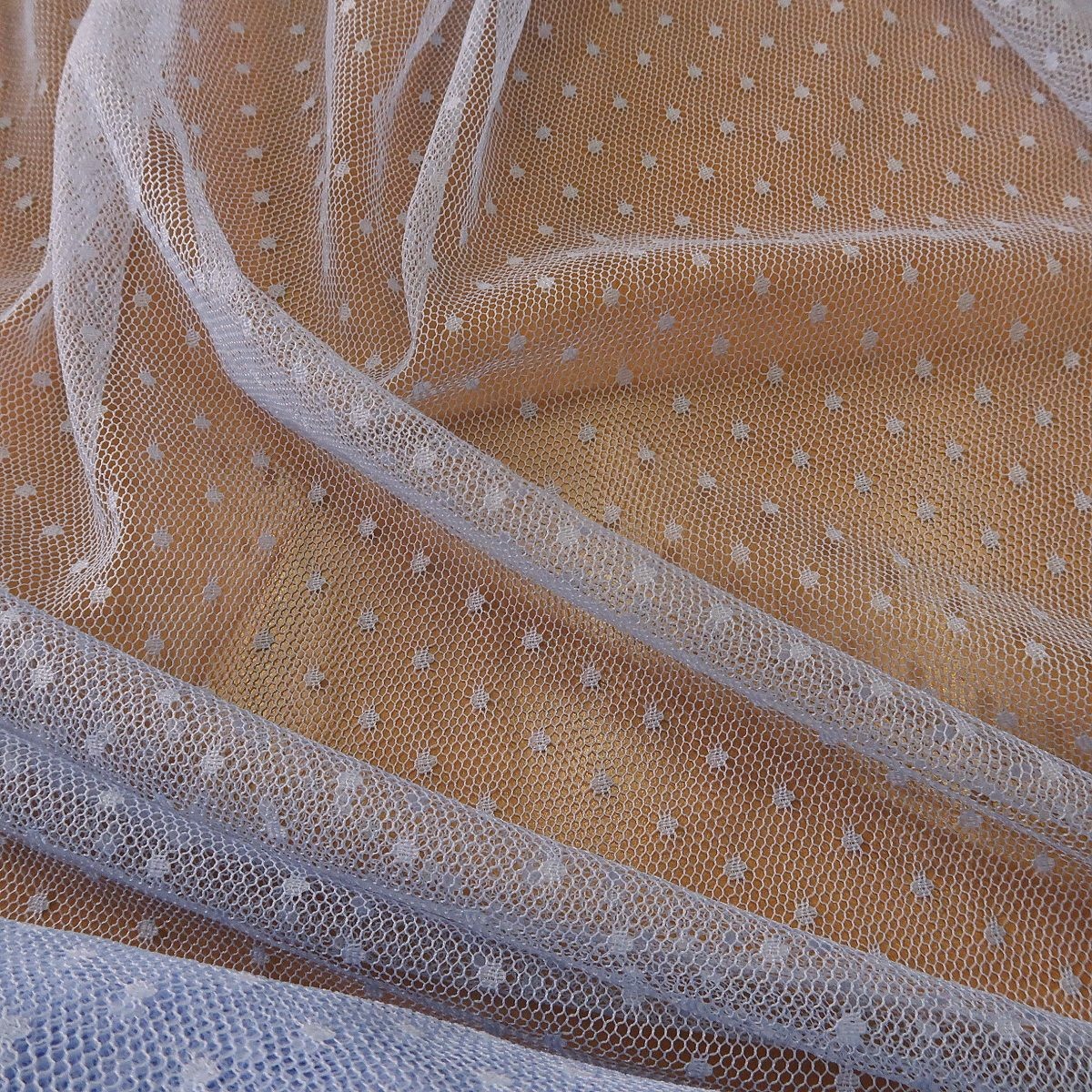 Tyl světle modrý s puntíčky je lehoučká, průsvitná do šíře pružící látka o gramáži cca 30 g/m2.
