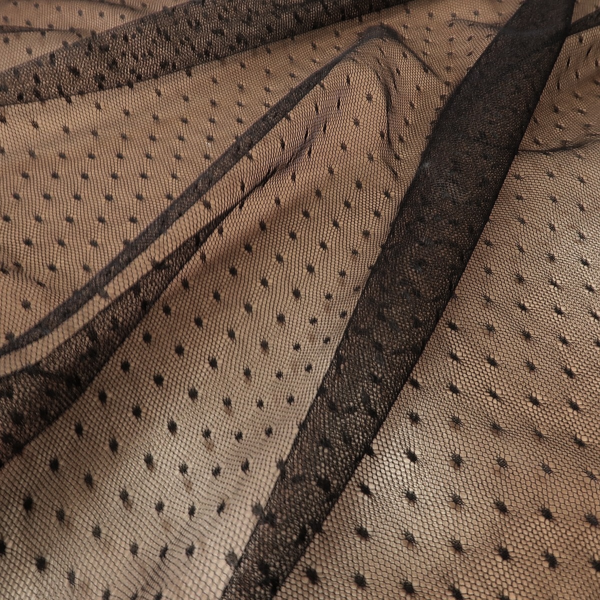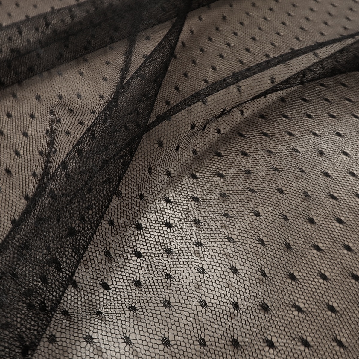 Tyl černý s puntíčky je lehoučká, průsvitná do šíře pružící látka o gramáži cca 30 g/m2.