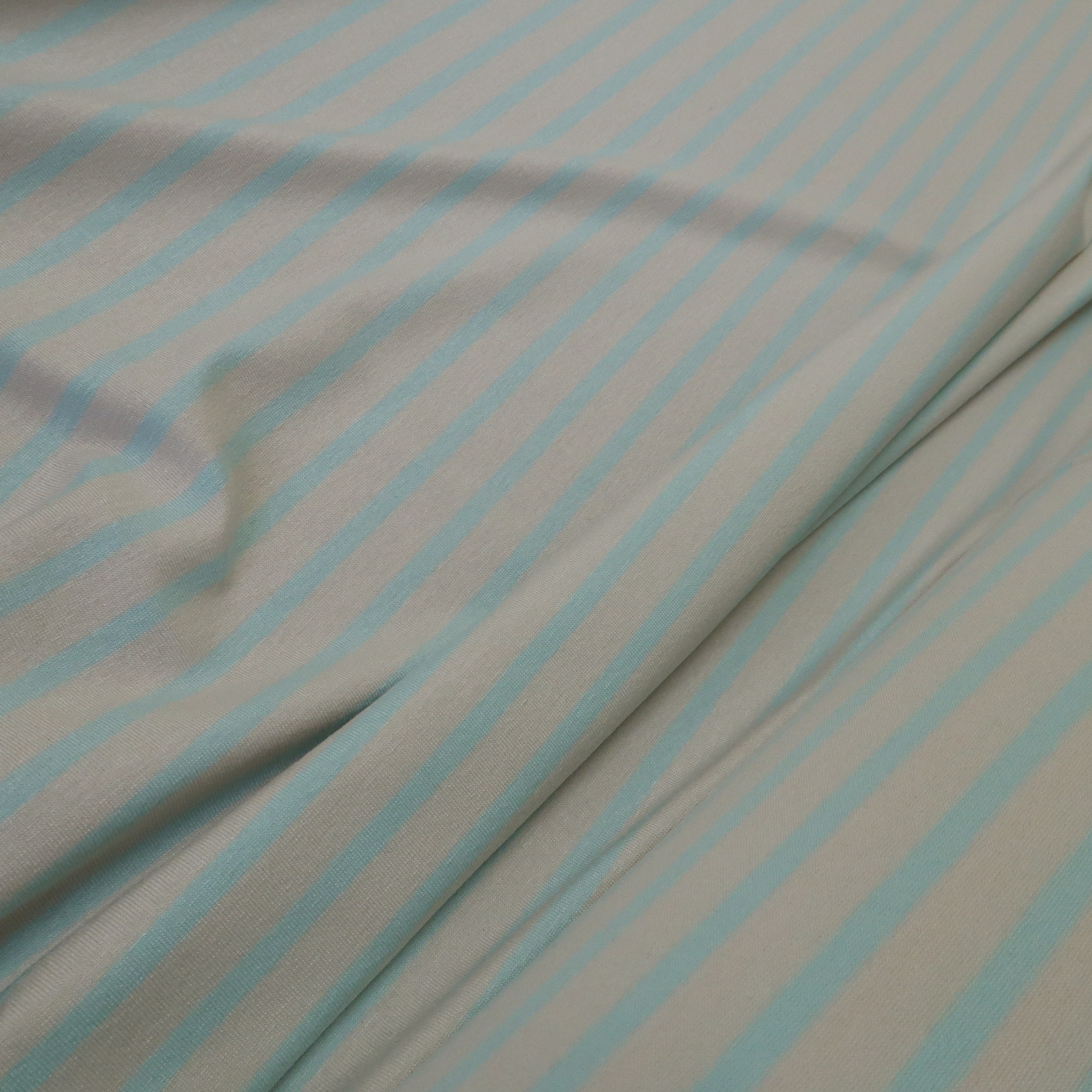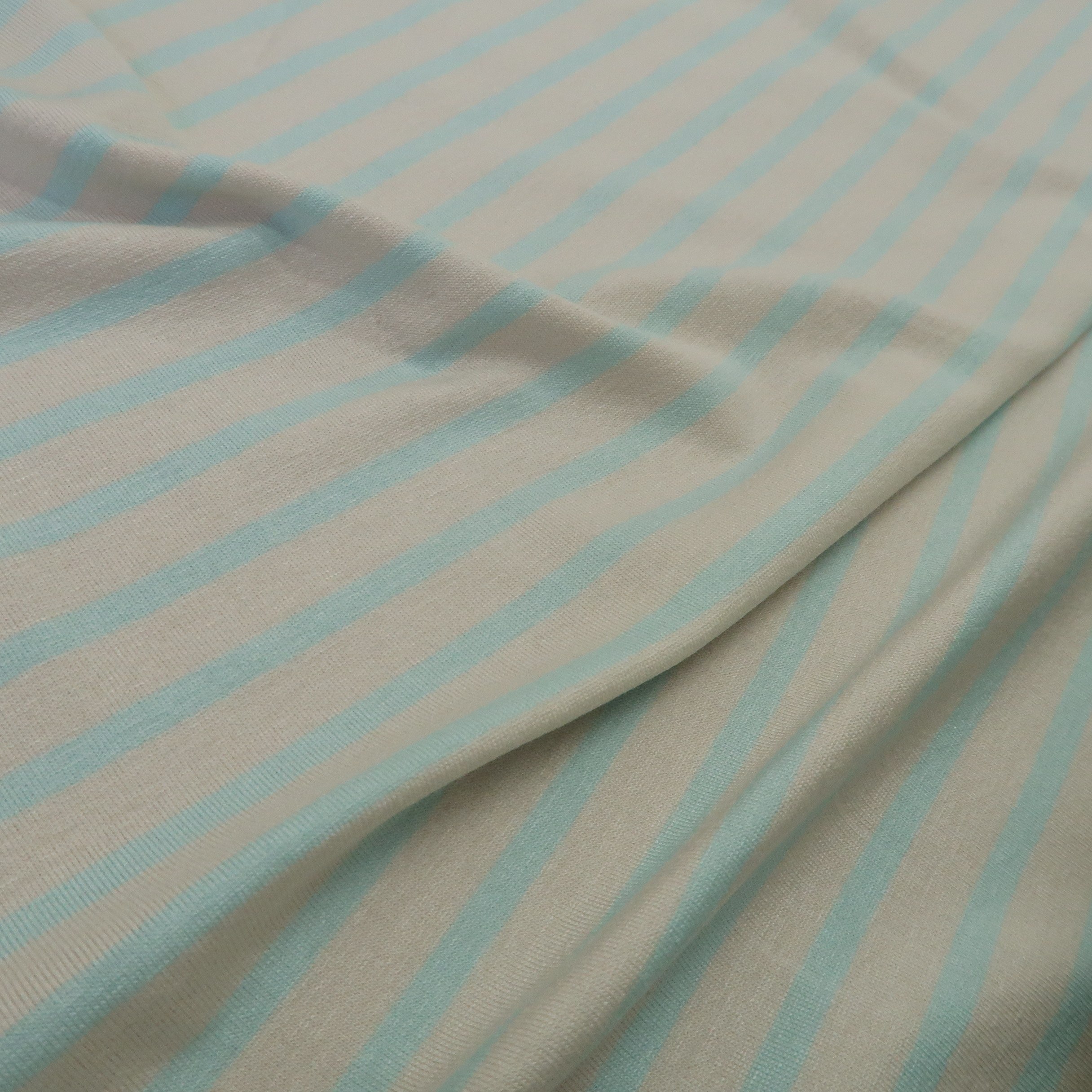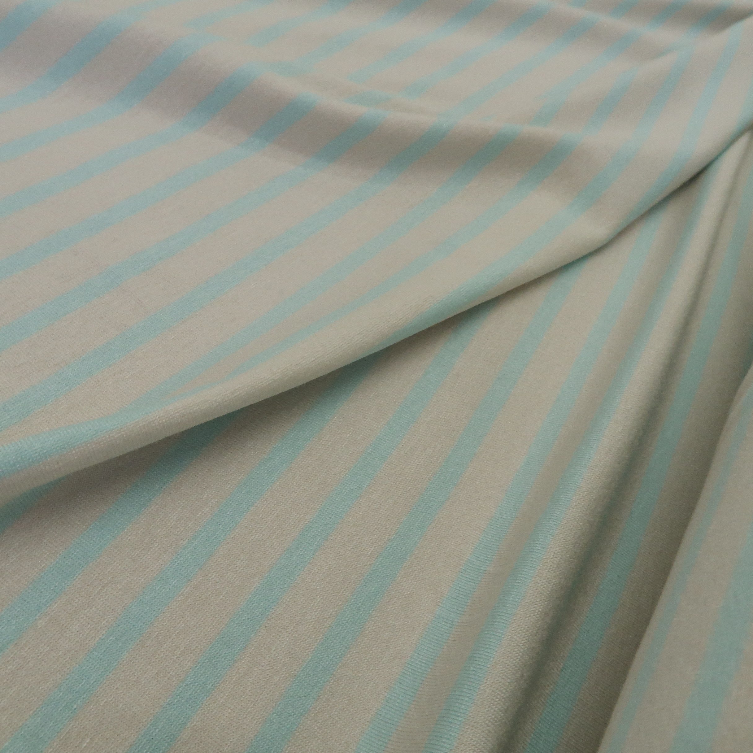Úplet v barvě slonové kosti s tyrkysovými proužky je klasický tričkový úplet. Gramáž je cca 230 g/m2.