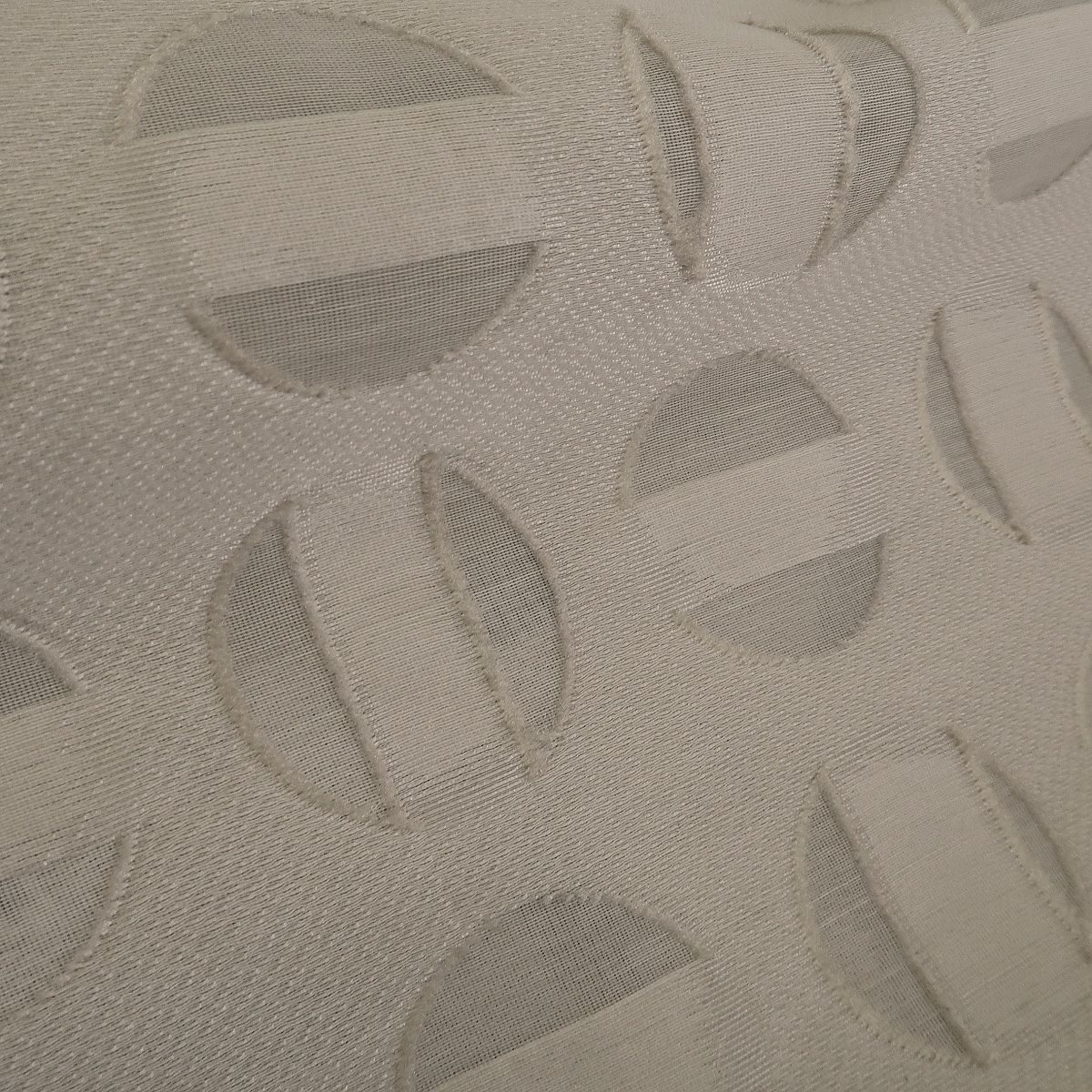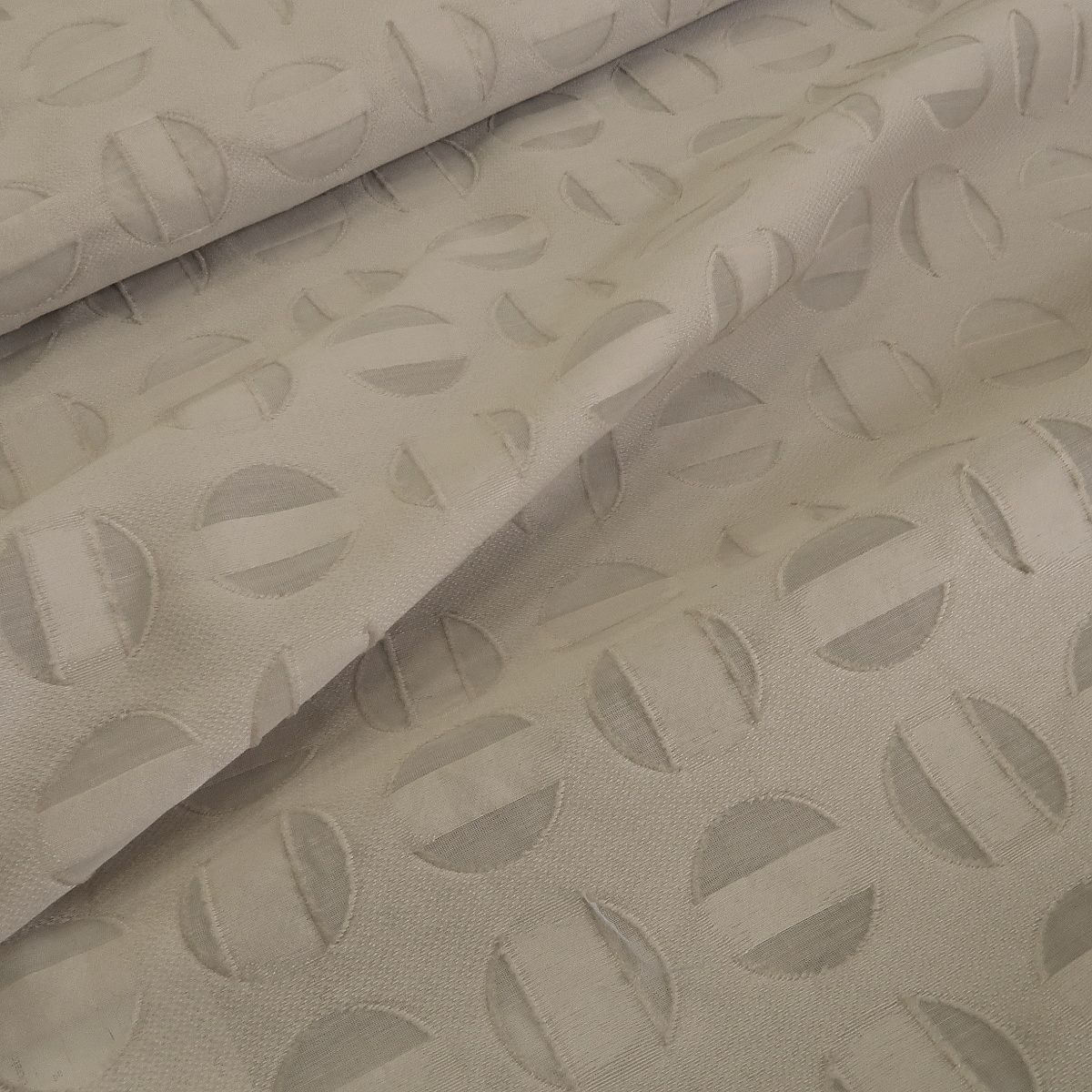 Žakár béžový á la devoré s průhlednými puntíky je látka, lehoučká, ale držící tvar. Puntíky mají průměr cca 3 cm.