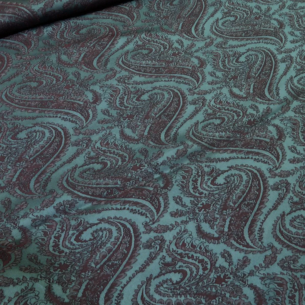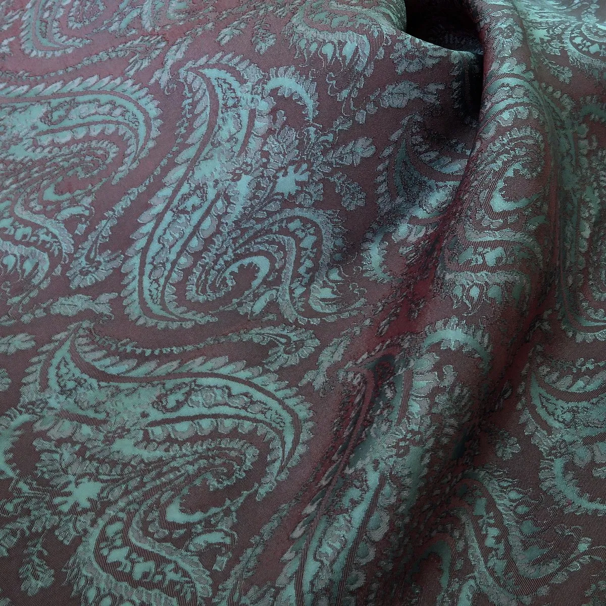 Žakár tyrkysovo-vínový je látka jemná, ale přitom držící tvar. Gramáž je cca 150 g/m2.