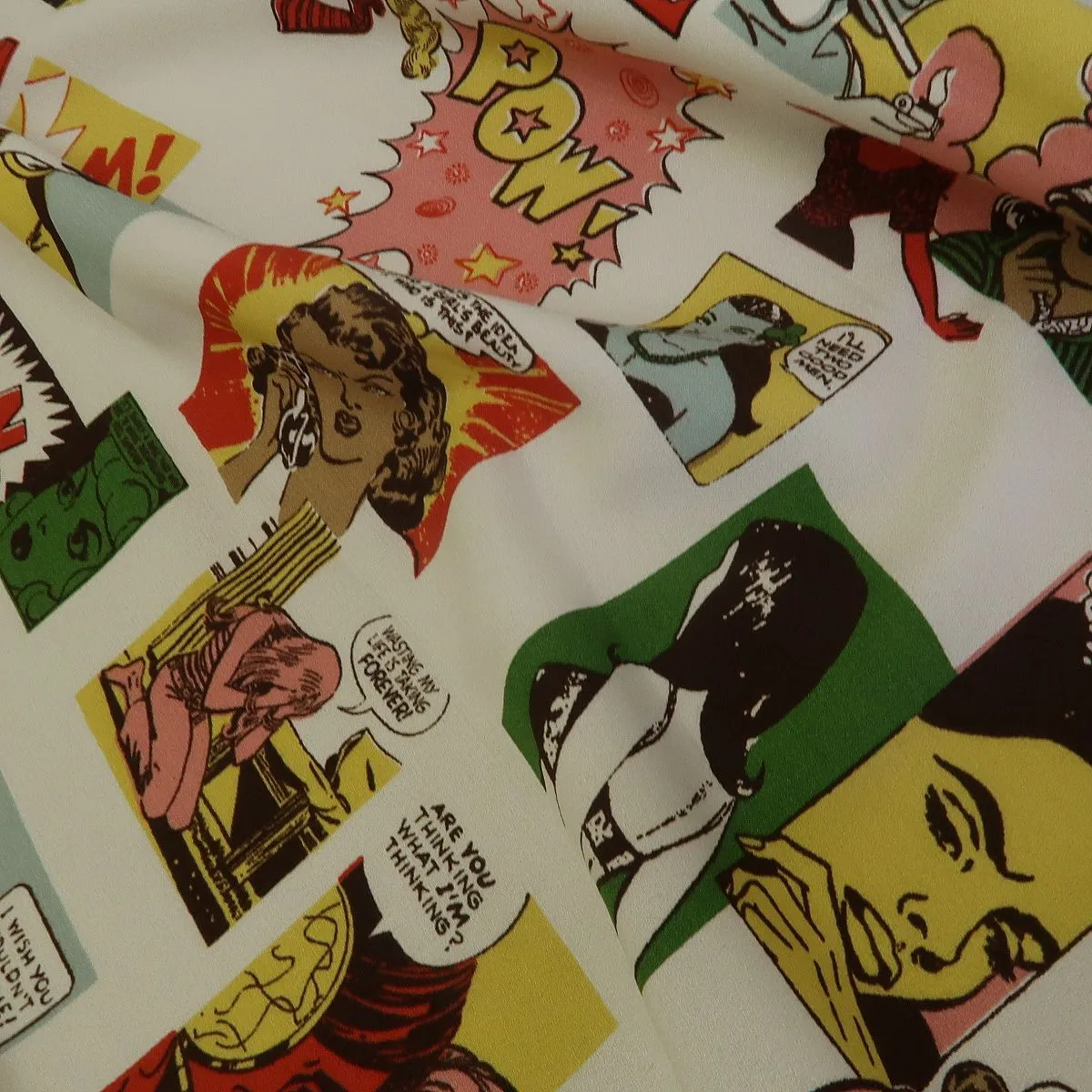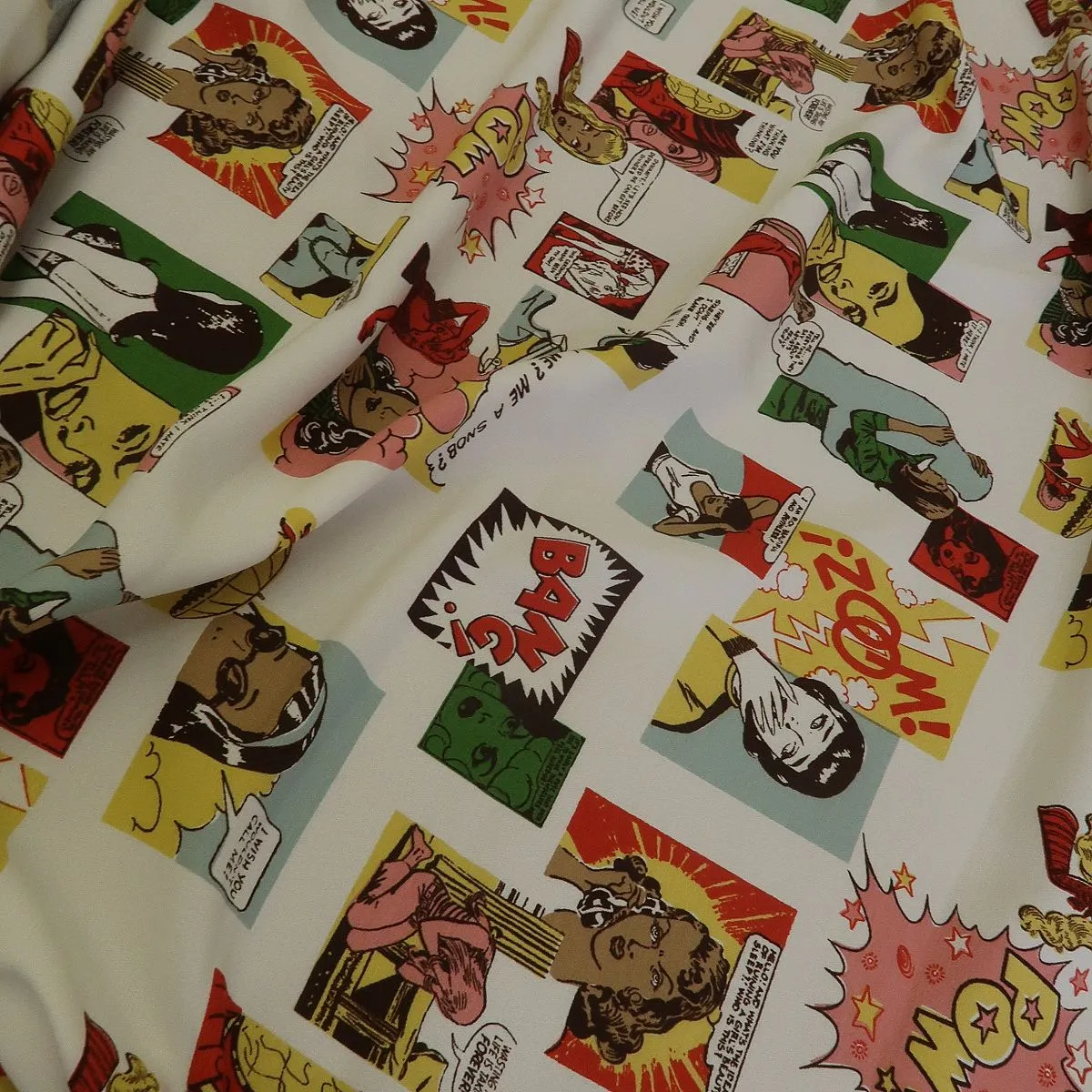 Žoržet bílý s komiksovým vzorem je lehká, splývavá, letní látka o gramáži cca 135 g/m2.